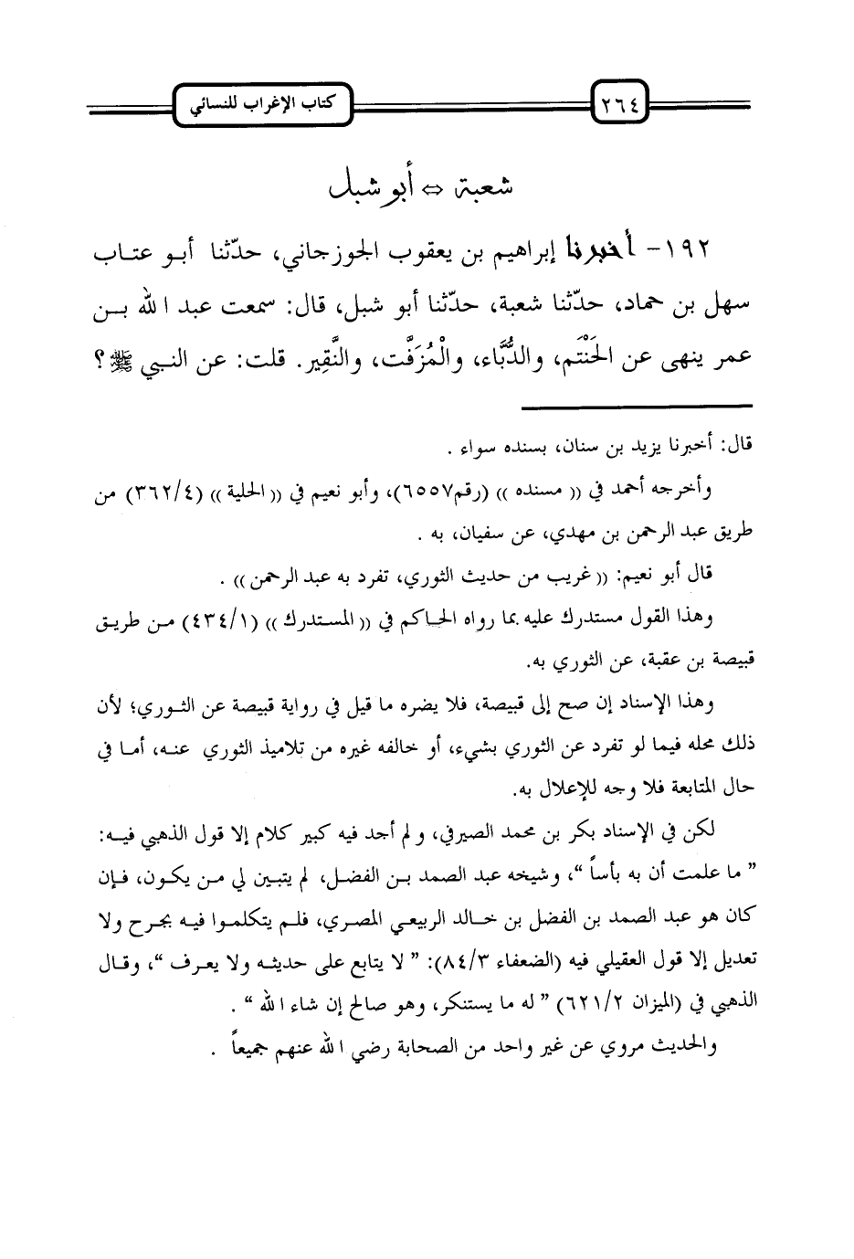 192 - أَخْبَرَنَا إِبْرَاهِيمُ بْنُ يَعْقُوبَ الْجُوزَجَانِيُّ، حَدَّثَنَا أَبُو عَتَّابٍ سَهْلُ بْنُ حَمَّادٍ، حَدَّثَنَا شُعْبَةُ، حَدَّثَنَا أَبُو شِبْلٍ، قَالَ: سَمِعْتُ عَبْدَ اللَّهِ بْنَ عُمَرَ يَنْهَى عَنِ الْحَنْتَمِ، وَالدُّبَّاءِ، وَالْمُزَفَّتِ، وَالنَّقِيرِ. قُلْتُ: عَنِ النَّبِيِّ صَلَّى اللَّهُ عَلَيْهِ وَسَلَّمَ؟ -[265]- قَالَ: نَعَمْ.