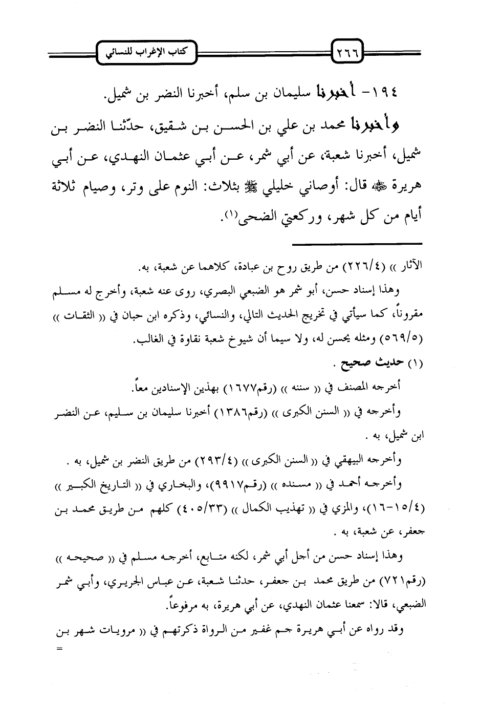 وَأَخْبَرَنَا مُحَمَّدُ بْنُ عَلِيِّ بْنِ الْحَسَنِ بْنِ شَقِيقٍ، حَدَّثَنَا النَّضْرُ بْنُ شُمَيْلٍ، أَخْبَرَنَا شُعْبَةُ، عَنْ أَبِي شِمْرٍ، عَنْ أَبِي عُثْمَانَ النَّهْدِيِّ، عَنْ أَبِي هُرَيْرَةَ رَضِيَ اللَّهُ عَنْهُ قَالَ: أَوْصَانِي خَلِيلِي صَلَّى اللَّهُ عَلَيْهِ وَسَلَّمَ بِثَلاثٍ: النَّوْمِ عَلَى وِتْرٍ، وَصِيَامِ ثَلاثَةِ أَيَّامٍ مِنْ كُلِّ شَهْرٍ، وَرَكْعَتَيِ الضُّحَى.