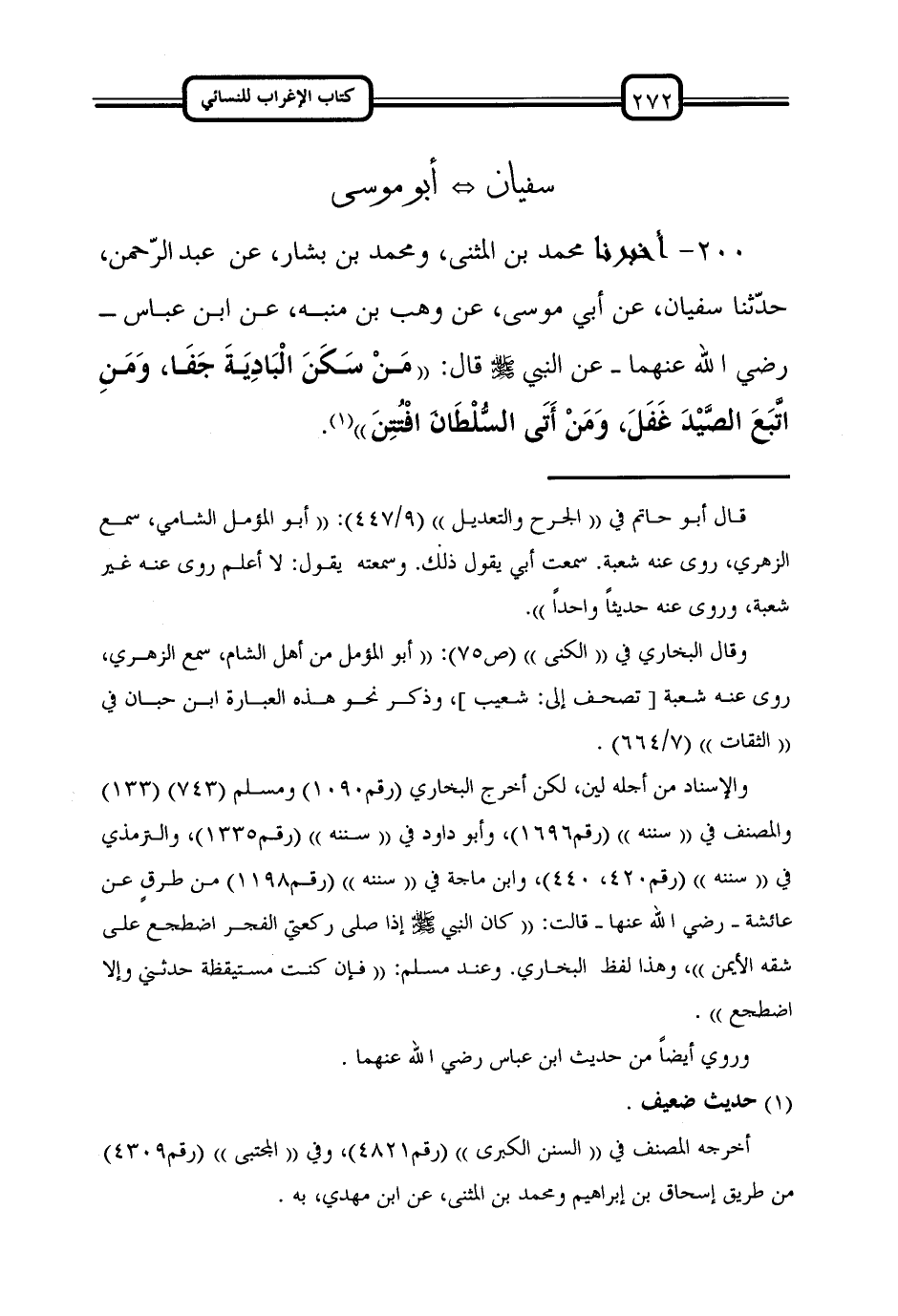 200 - أَخْبَرَنَا مُحَمَّدُ بْنُ الْمُثَنَّى، وَمُحَمَّدُ بْنُ بَشَّارٍ، عَنْ عَبْدِ الرَّحْمَنِ، حَدَّثَنَا سُفْيَانُ، عَنْ أَبِي مُوسَى، عَنْ وَهْبِ بْنِ مُنَبِّهٍ، عَنِ ابْنِ عَبَّاسٍ - رَضِيَ اللَّهُ عَنْهُمَا- عَنِ النَّبِيِّ صَلَّى اللَّهُ عَلَيْهِ وَسَلَّمَ قَالَ: ((مَنْ سَكَنَ الْبَادِيَةَ جَفَا، وَمَنِ اتَّبَعَ الصَّيْدَ غَفَلَ، وَمَنْ أَتَى السُّلْطَانَ افْتُتِنَ)).