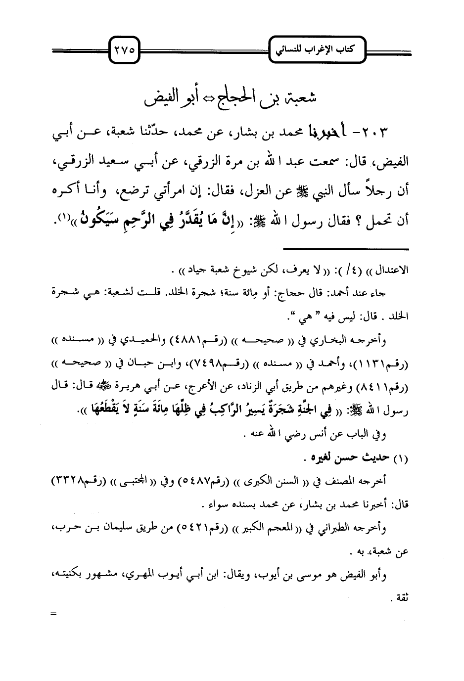 203 - أَخْبَرَنَا مُحَمَّدُ بْنُ بَشَّارٍ، عَنْ مُحَمَّدٍ، حَدَّثَنَا شُعْبَةُ، عَنْ أَبِي الْفَيْضِ، قَالَ: سَمِعْتُ عَبْدَ اللَّهِ بْنَ مُرَّةَ الزَّرْقِيَّ، عَنْ أَبِي سَعِيدٍ الزَّرْقِيِّ، أَنَّ رَجُلا سَأَلَ النَّبِيَّ صَلَّى اللَّهُ عَلَيْهِ وَسَلَّمَ عَنِ الْعَزْلِ، فَقَالَ: إِنَّ امْرَأَتِي تُرْضِعُ، وَأَنَا أَكْرَهُ أَنْ تَحْمِلَ؟ فَقَالَ رَسُولُ اللَّهِ صَلَّى اللَّهُ عَلَيْهِ وَسَلَّمَ: ((إِنَّ مَا يُقَدَّرُ فِي الرحم سيكون)).
