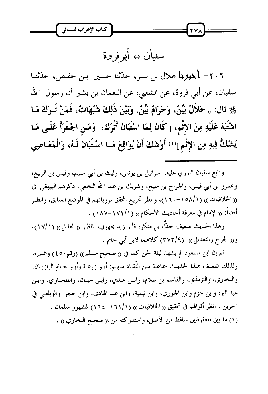 206 - أَخْبَرَنَا هِلالُ بْنُ بِشْرٍ، حَدَّثَنَا حُسَيْنُ بْنُ حَفْصٍ، حَدَّثَنَا سُفْيَانُ، عَنْ أَبِي فَرْوَةَ، عَنِ الشَّعْبِيِّ، عَنِ النُّعْمَانِ بْنِ بَشِيرٍ أَنَّ رَسُولَ اللَّهِ صَلَّى اللَّهُ عَلَيْهِ وسلم قال: ((حلالٌ بينٌ، وحرامٌ بينٌ، وَبَيْنَ ذَلِكَ شبهاتٌ، فَمَنْ تَرَكَ مَا اشْتَبَهَ عَلَيْهِ مِنَ الإِثْمِ، [كَانَ لِمَا اسْتَبَانَ أَتْرَكَ، وَمَنِ اجْتَرَأَ عَلَى مَا يَشُكُّ فِيهِ مِنَ الإِثْمِ] أَوْشَكَ أَنْ يُوَاقِعَ مَا اسْتَبَانَ لَهُ، وَالْمَعَاصِي -[279]- حِمَى اللَّهِ تَعَالَى، وَمَنْ يَرْتَعُ حَوْلَ الْحِمَى يُوشِكُ أَنْ يُوَاقِعَهُ)).