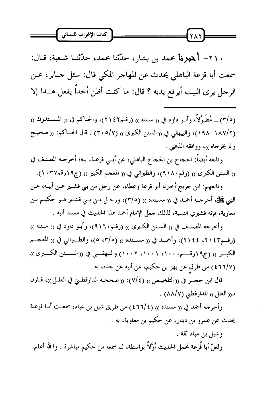 210 - أَخْبَرَنَا مُحَمَّدُ بْنُ بَشَّارٍ، حَدَّثَنَا مُحَمَّدٌ، حَدَّثَنَا شُعْبَةُ، قَالَ: سَمِعْتُ أَبَا قَزَعَةَ الْبَاهِلِيَّ يُحَدِّثُ عن المهاجر المكي قال: سئل جَابِرٌ، عَنِ الرَّجُلِ يَرَى الْبَيْتَ أَيَرْفَعُ يَدَيْهِ؟ قَالَ: مَا كُنْتُ أَظُنُّ أَحَدًا يَفْعَلُ هَذَا إِلا -[283]- الْيَهُودَ، وَقَدْ حَجَجْنَا مَعَ رَسُولِ اللَّهِ صَلَّى اللَّهُ عَلَيْهِ وَسَلَّمَ فَلَمْ يَكُنْ يَفْعَلُهُ.
