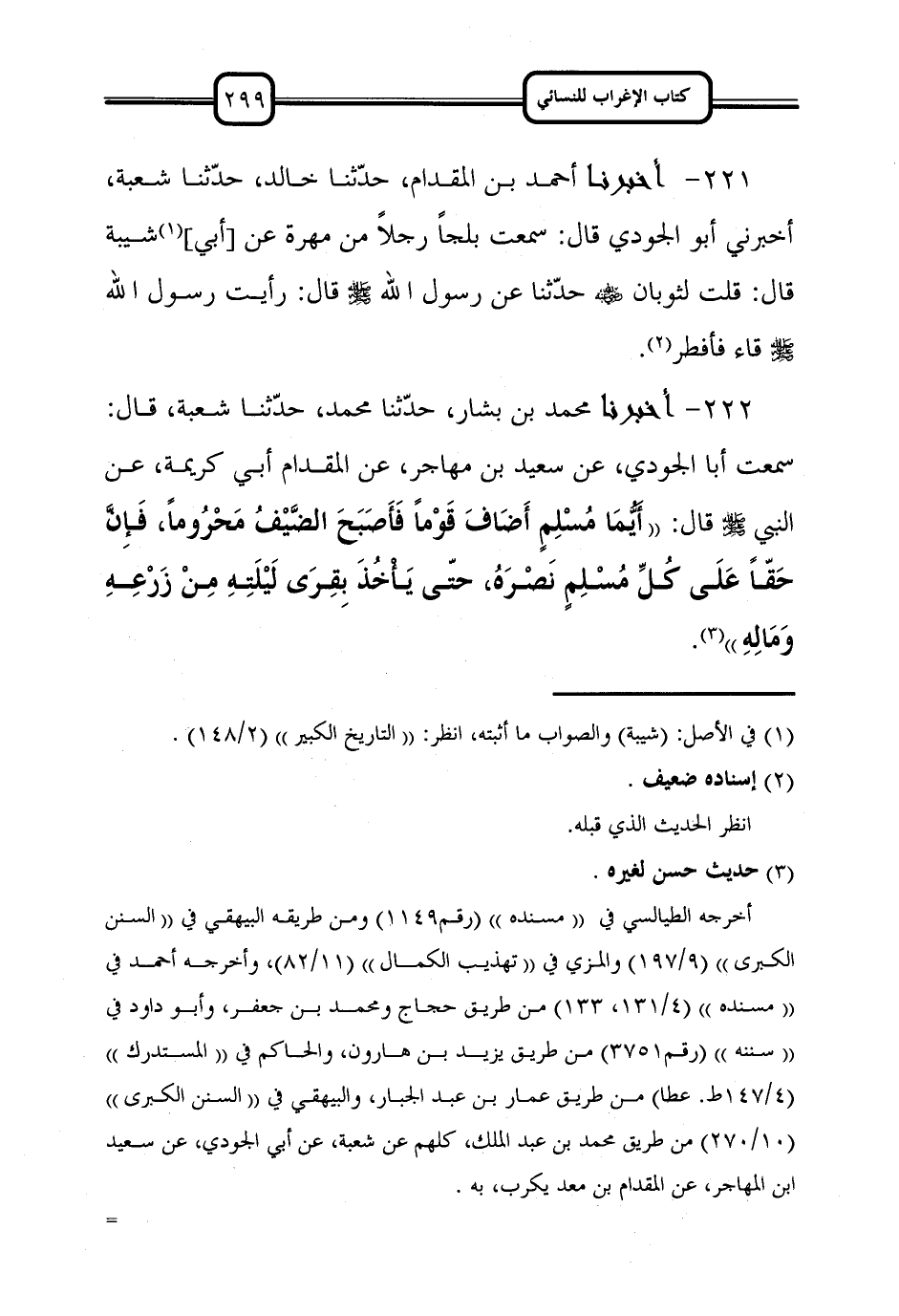 222 - أَخْبَرَنَا مُحَمَّدُ بْنُ بَشَّارٍ، حَدَّثَنَا مُحَمَّدٌ، حَدَّثَنَا شُعْبَةُ، قَالَ: سَمِعْتُ أَبَا الْجُودِيَّ، عَنْ سَعِيدِ بْنِ مُهَاجِرٍ، عَنِ الْمِقْدَامِ أَبِي كُرَيْمَةَ، عَنِ النَّبِيِّ صَلَّى اللَّهُ عَلَيْهِ وَسَلَّمَ قَالَ: ((أَيُّمَا مسلمٍ أَضَافَ قَوْمًا فَأَصْبَحَ الضَّيْفُ مَحْرُومًا، فَإِنَّ حَقًّا عَلَى كُلِّ مسلمٍ نَصْرُهُ، حَتَّى يَأْخُذَ بِقِرَى لَيْلَتِهِ مِنْ زَرْعِهِ وَمَالِهِ)).