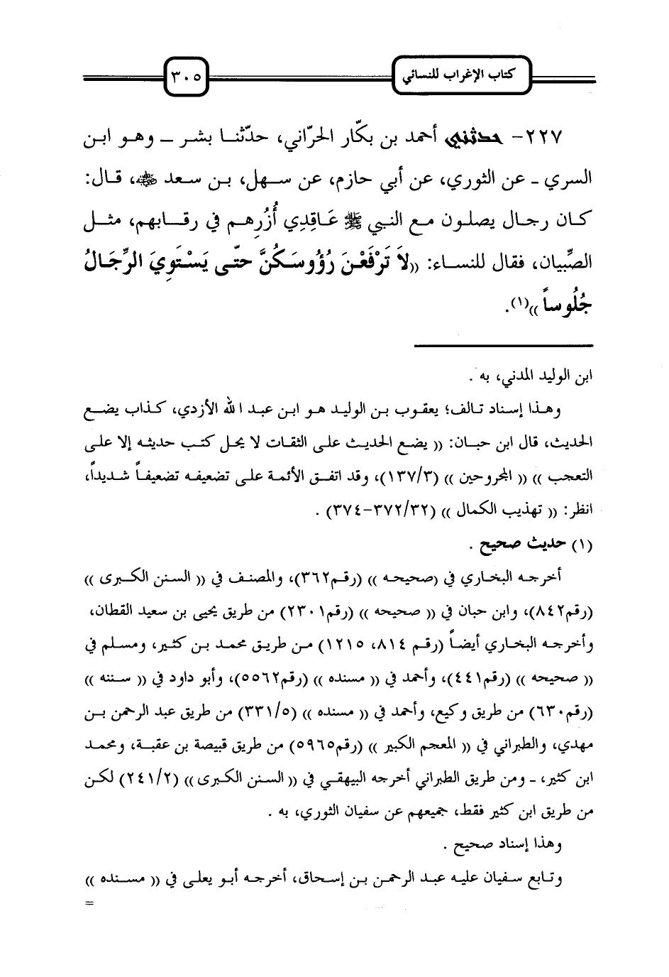 227 - حَدَّثَنِي أَحْمَدُ بْنُ بَكَّارٍ الْحَرَّانِيُّ، حَدَّثَنَا بِشْرٌ -وَهُوَ ابْنُ السَّرِيِّ- عَنِ الثَّوْرِيِّ، عَنْ أَبِي حَازِمٍ، عَنْ سَهْلِ بْنِ سَعْدٍ رَضِيَ اللَّهُ عَنْهُ، قَالَ: كَانَ رِجَالٌ يُصَلُّونَ مَعَ النَّبِيِّ صَلَّى اللَّهُ عَلَيْهِ وَسَلَّمَ عَاقِدِي أُزُرِهِمْ فِي رِقَابِهِمْ، مِثْلَ الصِّبْيَانِ، فَقَالَ لِلنِّسَاءِ: ((لا تَرْفَعْنَ رؤوسكن حَتَّى يَسْتَوِيَ الرِّجَالُ جُلُوسًا)).