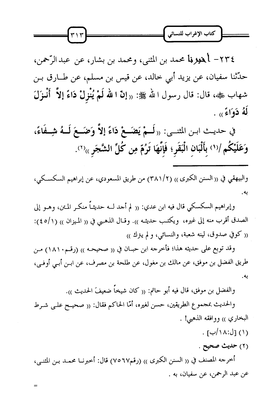 234 - أَخْبَرَنَا مُحَمَّدُ بْنُ الْمُثَنَّى، وَمُحَمَّدُ بْنُ بَشَّارٍ، عَنْ عَبْدِ الرَّحْمَنِ، حَدَّثَنَا سُفْيَانُ، عَنْ يَزِيدَ أَبِي خَالِدٍ، عَنْ قَيْسِ بْنِ مُسْلِمٍ، عَنْ طَارِقِ بْنِ شِهَابٍ رَضِيَ اللَّهُ عَنْهُ، قَالَ: قَالَ رَسُولُ اللَّهِ صَلَّى اللَّهُ عَلَيْهِ وَسَلَّمَ: ((إِنَّ اللَّهَ لَمْ يُنَزِّلْ دَاءً إِلا أَنْزَلَ لَهُ دَوَاءً)).