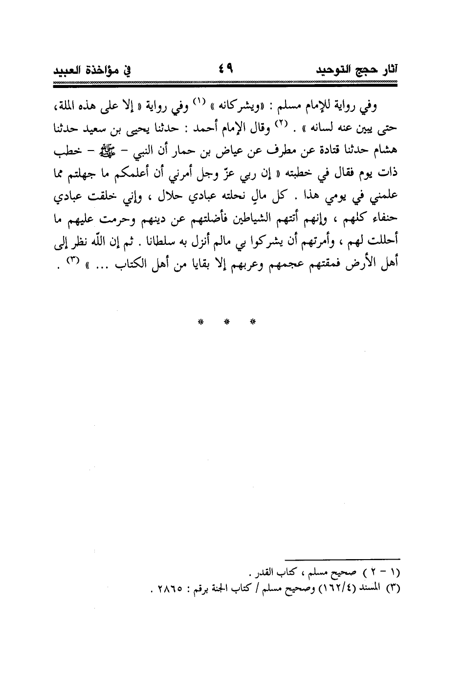 وفي رواية للإمام مسلم: "ويشركانه" (¬1) وفي رواية "إلا على هذه الملة، حتى يبين عنه لسانه". (¬2) وقال الإمام أحمد: حدثنا يحيى بن سعيد حدثنا هشام حدثنا قتادة عن مطرف عن عياض بن حمار أن النبي - صلى الله عليه وسلم - خطب ذات يوم فقال في خطبته "إن ربي عز وجل أمرني أن أعلمكم ما جهلتم مما علمني في يومي هذا. كل مال نحلته عبادي حلال، وإني خلقت عبادي حنفاء كلهم، وإنهم أتتهم الشياطين فأضلتهم عن دينهم وحرمت عليهم ما أحللت لهم، وأمرتهم أن يشركوا بي ما لم أنزل به سلطانا. ثم إن الله نظر إلى أهل الأرض فمقتهم عجمهم وعربهم إلا بقايا من أهل الكتاب ... " (¬3).