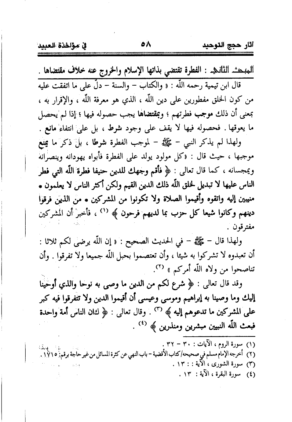 ولهذا لم يذكر النبي - صلى الله عليه وسلم - لموجب الفطرة شرطا، بل ذكر ما يمنع موجبها، حيث قال: "كل مولود يولد على الفطرة فأبواه يهودانه وينصرانه ويمجسانه، كما قال تعالى: (فَأَقِمْ وَجْهَكَ لِلدِّينِ حَنِيفاً فِطْرَتَ اللَّهِ الَّتِي فَطَرَ النَّاسَ عَلَيْهَا لا تَبْدِيلَ لِخَلْقِ اللَّهِ ذَلِكَ الدِّينُ الْقَيِّمُ وَلَكِنَّ أَكْثَرَ النَّاسِ لا يَعْلَمُونَ، مُنِيبِينَ إِلَيْهِ وَاتَّقُوهُ وَأَقِيمُوا الصَّلاةَ وَلا تَكُونُوا مِنَ الْمُشْرِكِينَ، مِنَ الَّذِينَ فَرَّقُوا دِينَهُمْ وَكَانُوا شِيَعاً كُلُّ حِزْبٍ بِمَا لَدَيْهِمْ فَرِحُونَ) (¬1)، فأخبر أن المشركين مفترقون.