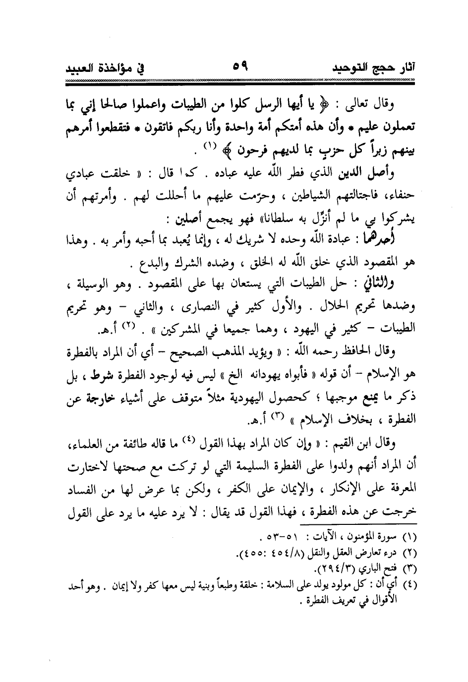 وقال الحافظ رحمه الله: "ويؤيد المذهب الصحيحح - أي أن المراد بالفطرة هو الإسلام - أن قوله "فأبواه يهودانه الخ" ليس فيه لوجود الفطرة شرط، بل ذكر ما يمنع موجبها؛ كحصول اليهودية مثلاً متوقف على أشياء خارجة عن الفطرة، بخلاف الإسلام" (¬3) أ. هـ.