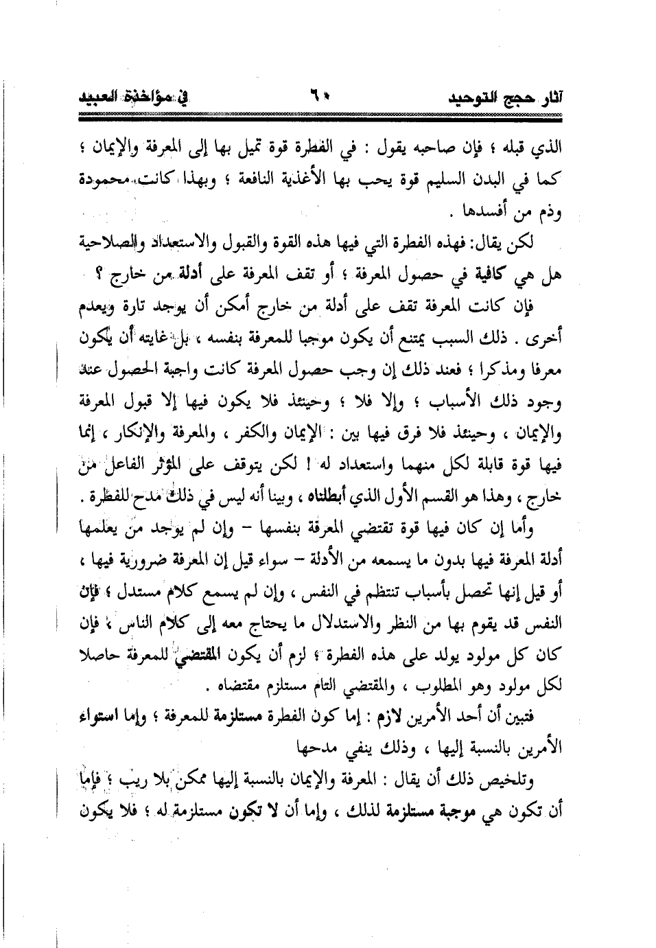 فإن كانت المعرفة تقف على أدلة من خارج أمكن أن يوجد تارة ويعدم أخرى. ذلك السبب يمتنع أن يكون موجبا للمعرفة بنفسه، بل غايته أن يكون معرفا ومذكرا؛ فعند ذلك إن وجب حصول المعرفة كانت واجبة الحصول عند وجود ذلك الأسباب؛ وإلا فلا؛ وحينئذ فلا يكون فيها إلا قبول المعرفة والإيمان، وحينئذ فلا فرق فيها بين: الإيمان والكفر، والمعرفة والإنكار، إنما فيها قوة قابلة لكل منهما واستعداد له! لكن يتوقف على المؤثر الفاعل من خارج، وهذا هو القسم الأول الذي أبطلناه، وبينا أنه ليس في ذلك مدح للفطرة.