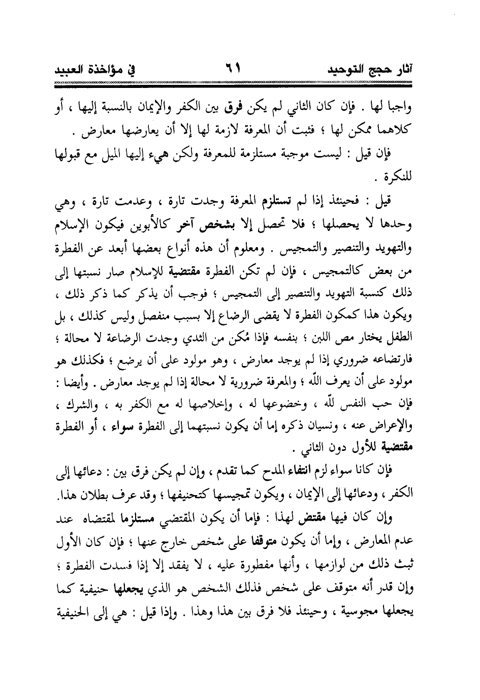 قيل: فحينئذ إذا لم تستلزم المعرفة وجدت تارة، وعدمت تارة، وهي وحدها لا يحصلها؛ فلا تحصل إلا بشخص آخر كالأبوين فيكون الإسلام والتهويد والتنصير والتمجيس. ومعلوم أن هذه أنواع بعضها أبعد عن الفطرة من بعض كالتمجيس، فإن لم تكن الفطرة مقتضية للإسلام صار نسبتها إلى ذلك كنسبة التهويد والتنصير إلى التمجيس؛ فوجب أن يذكر كما ذكر ذلك، ويكون هذا كمكون الفطرة لا يقضى الرضاع إلا بسبب منفصل وليس كذلك، بل الطفل يختار مص اللبن؛ بنفسه فإذا مُكن من الثدي وجدت الرضاعة لا محالة؛ فارتضاعه ضروري إذا لم يوجد معارض، وهو مولود على أن يرضع؛ فكذلك هو مولود على أن يعرف الله؛ والمعرفة ضرورية لا محالة إذا لم يوجد معارض. وأيضا: فإن حب النفس لله، وخضوعها له، وإخلاصها له مع الكفر به، والشرك، والإعراض عنه، ونسيان ذكره إما أن يكون نسبتهما إلى الفطرة سواء، أو الفطرة مقتضية للأول دون الثاني.