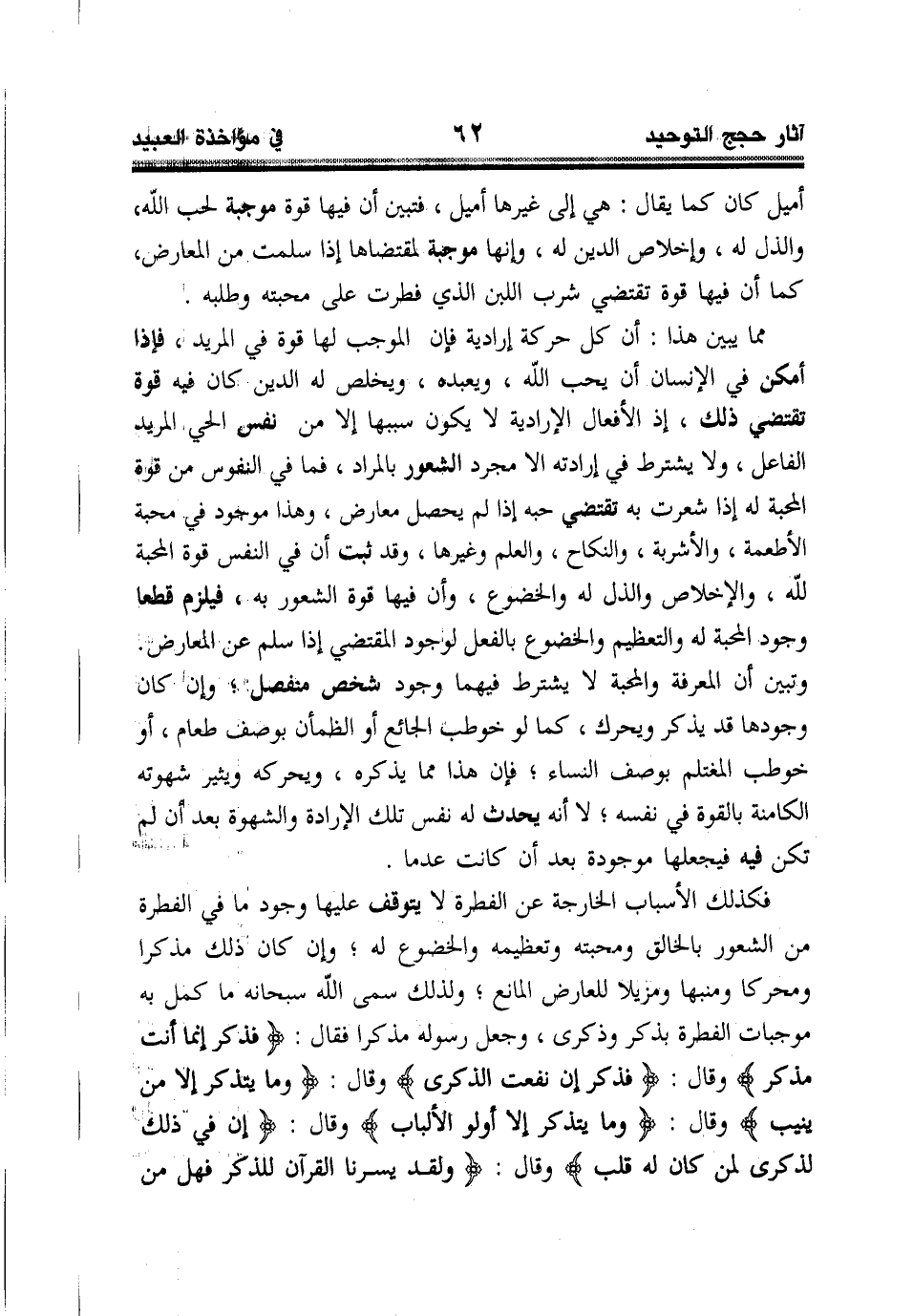 مما يبين هذا: أن كل حركة إرادية فإن الموجب لها قوة في المريد، فإذا أمكن في الإنسان أن يحب الله، ويعبده، ويخلص له الدين كان فيه قوة تقتضي ذلك، إذ الأفعال الإرادية لا يكون سببها إلا من نفس الحي المريد الفاعل، ولا يشترط في إرادته إلا مجرد الشعور بالمراد، فما في النفوس من قوة المحبة له إذا شعرت به تقتضي حبه إذا لم يحصل معارض، وهذا موجود في محبة الأطعمة، والأشربة، والنكاح، والعلم وغيرها، وقد ثبت أن في النفس قوة المحبة لله، والإخلاص والذل له والخضوع، وأن فيها قوة الشعور به، فيلزم قطعا وجود المحبة له والتعظيم والخضوع بالفعل لوجود المقتضي إذا سلم عن المعارض. وتبين أن المعرفة والمحبة لا يشترط فيهما وجود شخص منفصل؛ وإن كان وجودها قد يذكر ويحرك، كما لو خوطب الجائع أو الظمآن بوصف طعام، أو خوطب المغتلم بوصف النساء؛ فإن هذا مما يذكره، ويحركه ويثير شهوته الكامنة بالقوة في نفسه؛ لا أنه يحدث له نفس تلك الإرادة والشهوة بعد أن لم تكن فيه فيجعلها موجودة بعد أن كانت عدما.