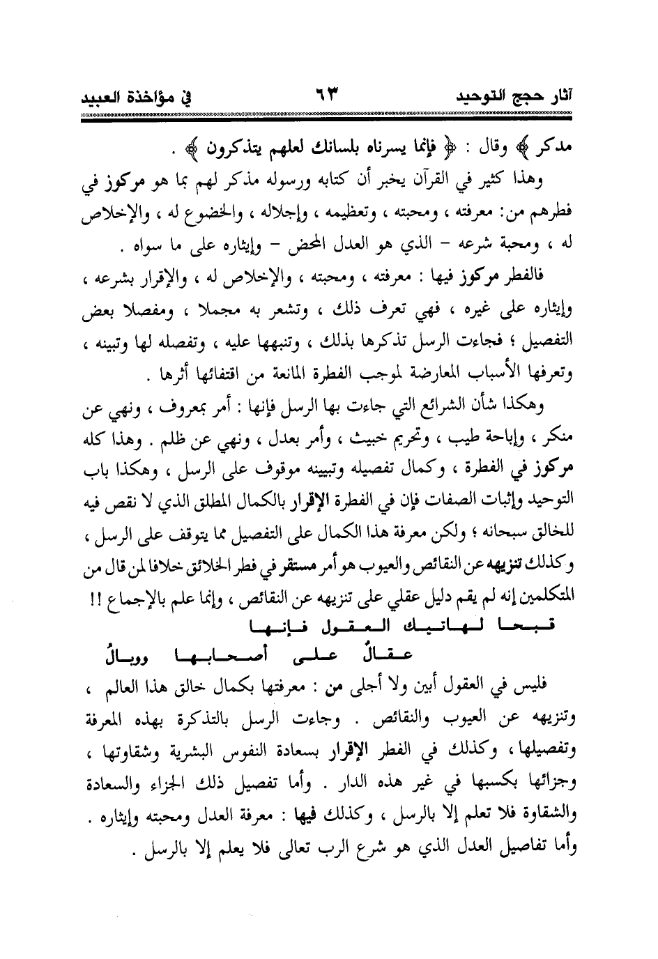 وهذا كثير في القرآن يخبر أن كتابه ورسوله مذكر لهم بما هو مركوز في فطرهم من: معرفته، ومحبته، وتعظيمه، وإجلاله، والخضوع له، والإخلاص له، ومحبة شرعه - الذي هو العدل المحض - وإيثاره على ما سواه.