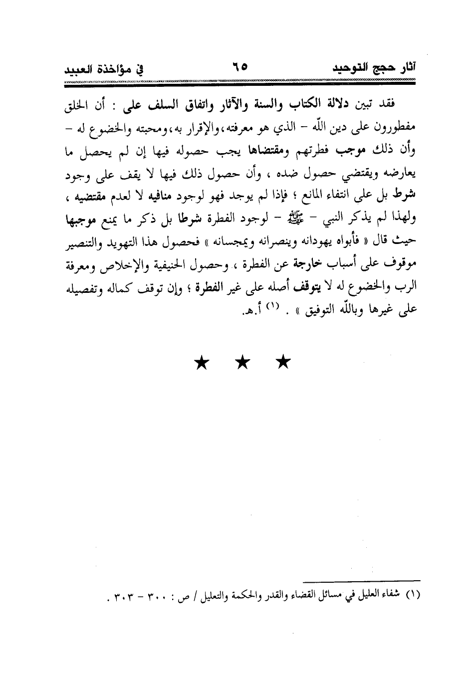 فقد تبين دلالة الكتاب والسنة والآثار واتفاق السلف على: أن الخلق مفطورون على دين الله - الذي هو معرفته، والإقرار به، ومحبته والخضوع له - وأن ذلك موجب فطرتهم ومقتضاها يجب حصوله فيها إن لم يحصل ما يعارضه ويقتضي حصول ضده، وأن حصول ذلك فيها لا يقف على وجود شرط بل على انتفاء المانع؛ فإذا لم يوجد فهو لوجود منافيه لا لعدم مقتضيه، ولهذا لم يذكر النبي - صلى الله عليه وسلم - لوجود الفطرة شرطا بل ذكر ما يمنع موجبها حيث قال "فأبواه يهودانه وينصرانه ويمجسانه" فحصول هذا التهويد والتنصير موقوف على أسباب خارجة عن الفطرة، وحصول الحنيفية والإخلاص ومعرفة الرب والخضوع له لا يتوقف أصله على غير الفطرة؛ وإن توقف كماله وتفصيله على غيرها وبالله التوفيق". (¬1) أ. هـ.