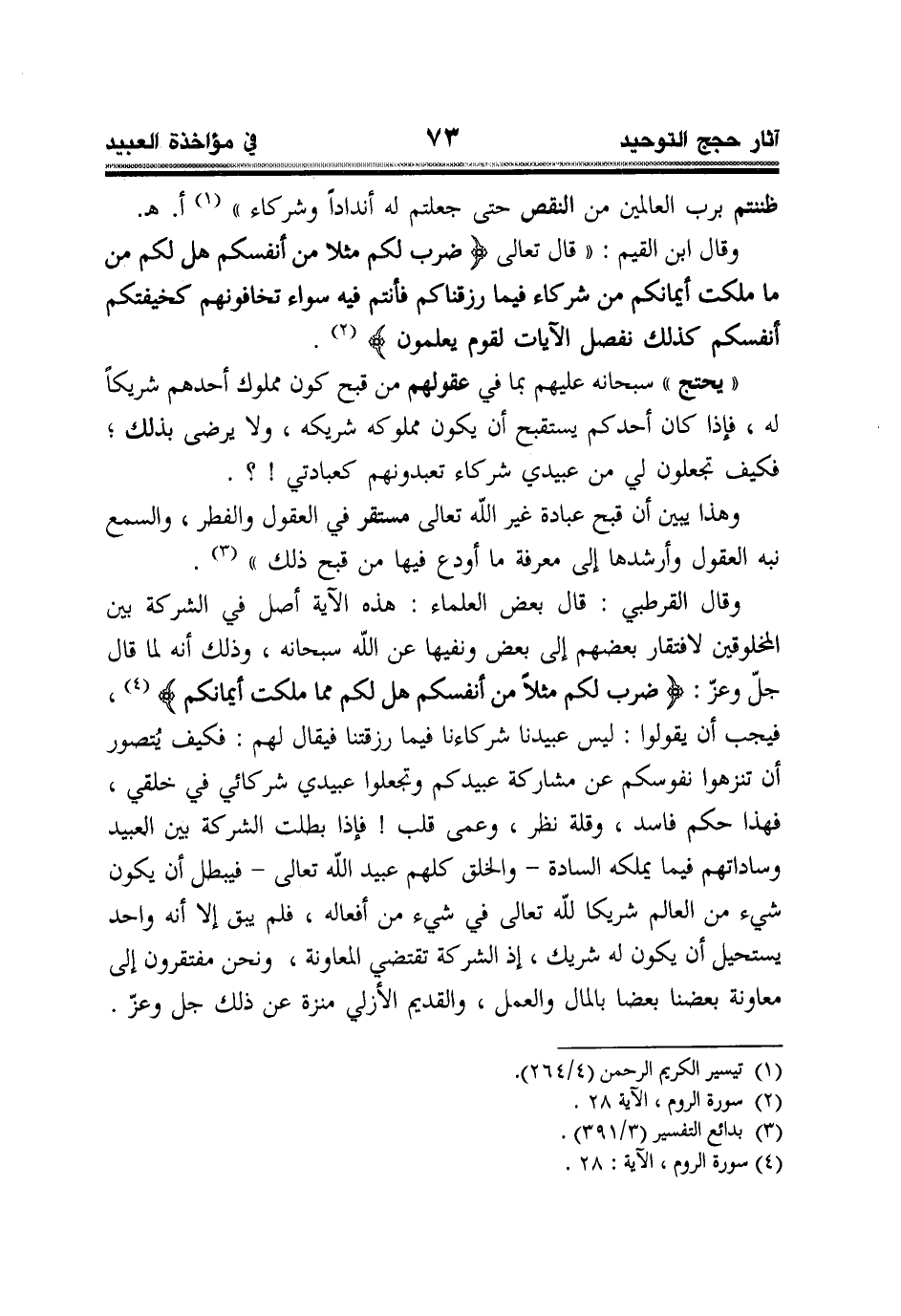 وقال ابن القيم: "قال تعالى: (ضَرَبَ لَكُمْ مَثَلاً مِنْ أَنْفُسِكُمْ هَلْ لَكُمْ مِنْ مَا مَلَكَتْ أَيْمَانُكُمْ مِنْ شُرَكَاءَ فِي مَا رَزَقْنَاكُمْ فَأَنْتُمْ فِيهِ سَوَاءٌ تَخَافُونَهُمْ كَخِيفَتِكُمْ أَنْفُسَكُمْ كَذَلِكَ نُفَصِّلُ الْآياتِ لِقَوْمٍ يَعْقِلُونَ) (¬2).