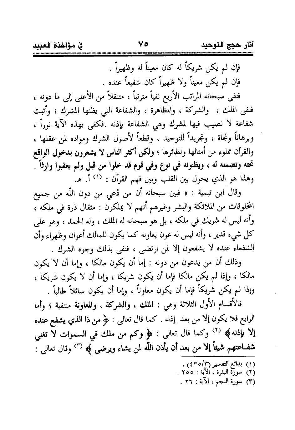 فنفى سبحانه المراتب الأربع نفياً مترتباً، متنقلاً من الأعلى إلى ما دونه، فنفى الملك، والشركة، والمظاهرة، والشفاعة التي يظنها المشرك؛ وأثبت شفاعة لا نصيب فيها لمشرك وهي الشفاعة بإذنه. فكفى بهذه الآية نوراً، وبرهاناً ونجاة، وتجريداً للتوحيد، وقطعاً لأصول الشرك ومواده لمن عقلها، والقرآن مملوء من أمثالها ونظائرها؛ ولكن أكثر الناس لا يشعرون بدخول الواقع تحته وتضمنه له، ويظنونه في نوع وفي قوم قد خلوا من قبل ولم يعقبوا وارثاً. وهذا هو الذي يحول بين القلب وبين فهم القرآن" (¬1) أ. هـ.