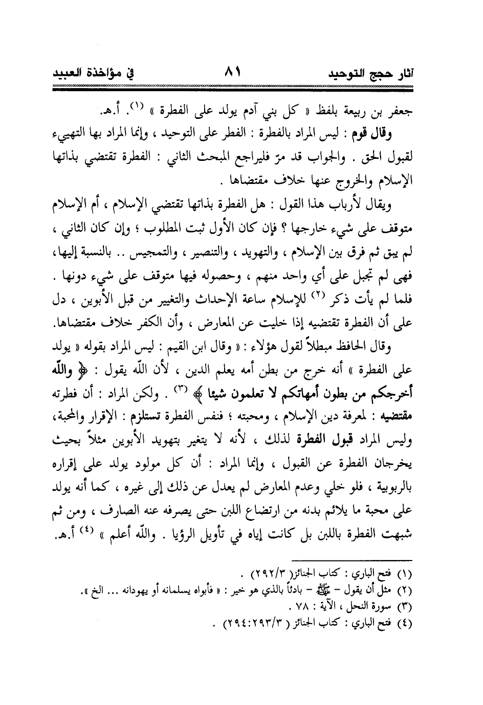 وقال الحافظ مبطلاً لقول هؤلاء: "وقال ابن القيم: ليس المراد بقوله "يولد على الفطرة" أنه خرج من بطن أمه يعلم الدين، لأن الله يقول: (وَاللَّهُ أَخْرَجَكُمْ مِنْ بُطُونِ أُمَّهَاتِكُمْ لا تَعْلَمُونَ شَيْئاً) (¬3). ولكن المراد: أن فطرته مقتضيه: لمعرفة دين الإسلام، ومحبته؛ فنفس الفطرة تستلزم: الإقرار والمحبة، وليس المراد قبول الفطرة لذلك، لأنه لا يتغير بتهويد الأبوين مثلاً بحيث يخرجان الفطرة عن القبول، وإنما المراد: أن كل مولود يولد على إقراره بالربوبية، فلو خلي وعدم المعارض لم يعدل عن ذلك إلى غيره، كما أنه يولد على محبة ما يلائم بدنه من ارتضاع اللبن حتى يصرفه عنه الصارف، ومن ثم شبهت الفطرة باللبن بل كانت إياه في تأويل الرؤيا. والله أعلم" (¬4) أ. هـ.