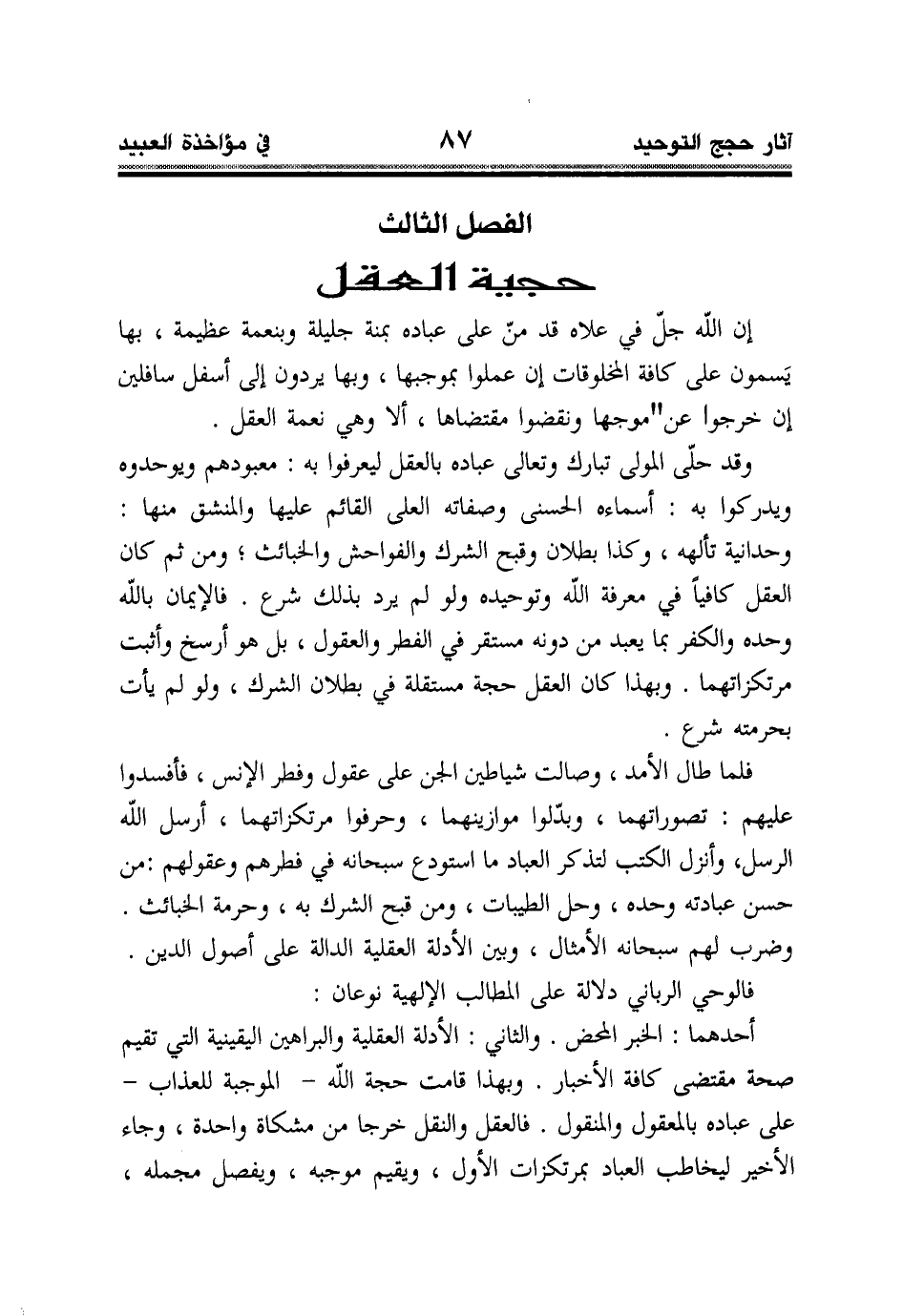 وقد حلّى المولى تبارك وتعالى عباده بالعقل ليعرفوا به: معبودهم ويوحدوه ويدركوا به: أسماءه الحسنى وصفاته العلى القائم عليها والمنشق منها: وحدانية تألهه، وكذا بطلان وقبح الشرك والفواحش والخبائث؛ ومن ثم كان العقل كافياً في معرفة الله وتوحيده ولو لم يرد بذلك شرع. فالإيمان بالله وحده والكفر بما يعبد من دونه مستقر في الفطر والعقول، بل هو أرسخ وأثبت مرتكزاتهما. وبهذا كان العقل حجة مستقلة في بطلان الشرك، ولو لم يأت بحرمته شرع.
