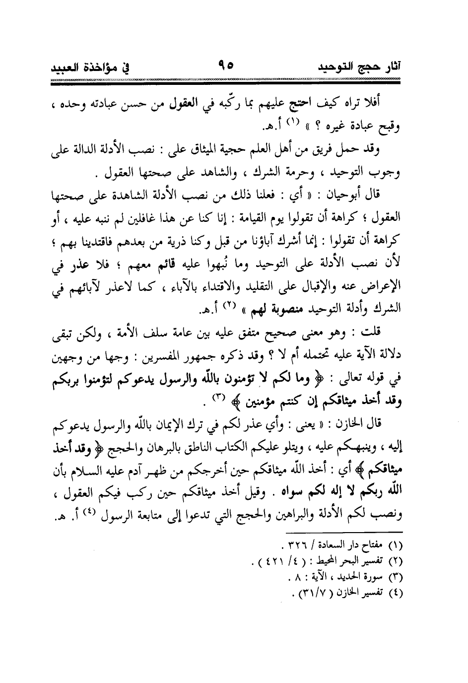 أفلا تراه كيف احتج عليهم بما ركّبه في العقول من حسن عبادته وحده، وقبح عبادة غيره؟ " (¬1) أ. هـ.