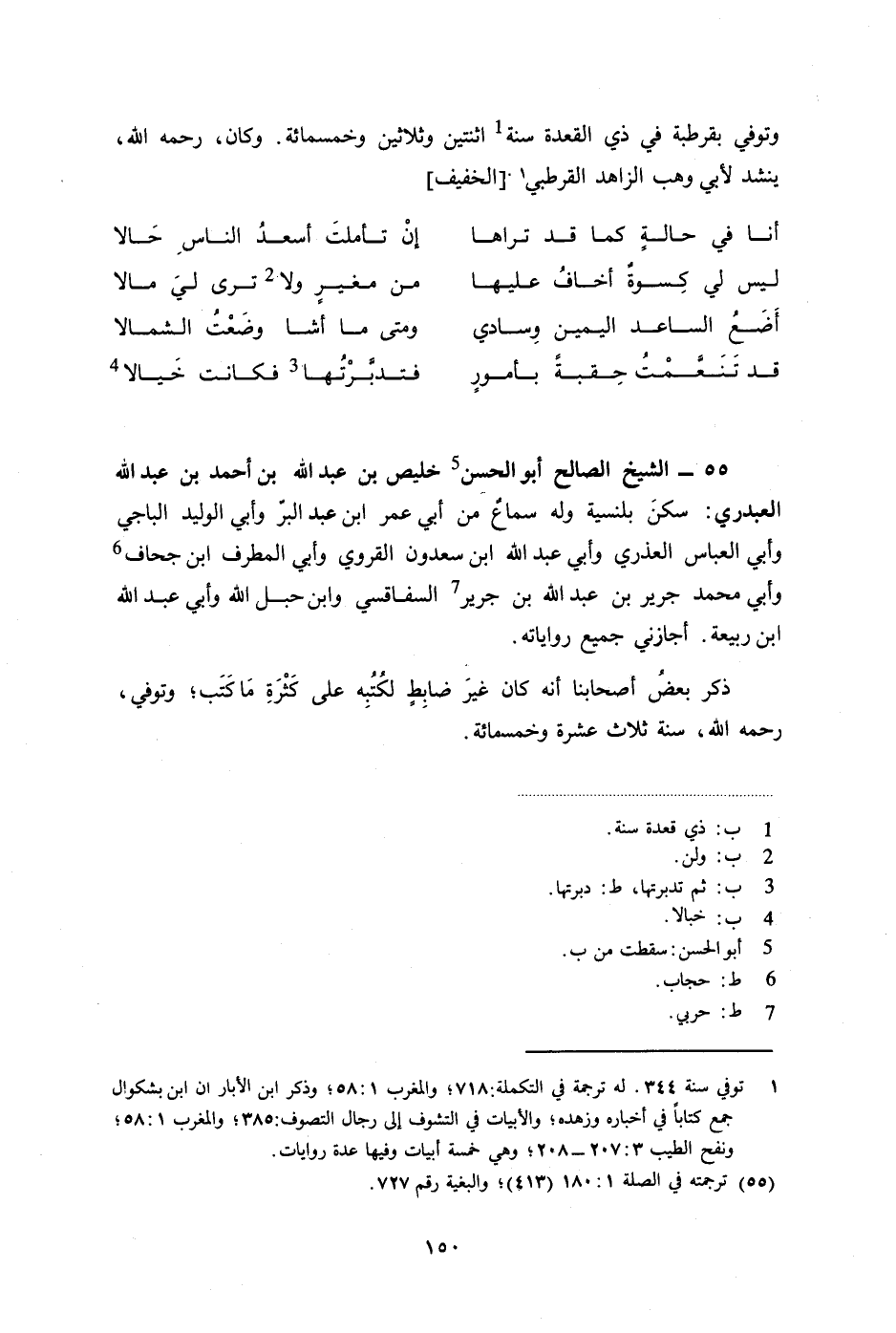 55- الشيخ الصالح أبو الحسن خليص بن عبد الله بن أحمد بن عبد الله العبدري: سكن بلنسية وله سماعٌ من أبي عمر ابن عبد البر وأبي الوليد الباجي وأبي العباس العذري وأبي عبد الله ابن سعدون القروي وأبي المطرف ابن جحاف وأبي محمد جرير بن عبد الله بن جرير السفاقسي وابن حبل الله وأبي عبد الله ابن ربيعة. أجازني جميع رواياته.