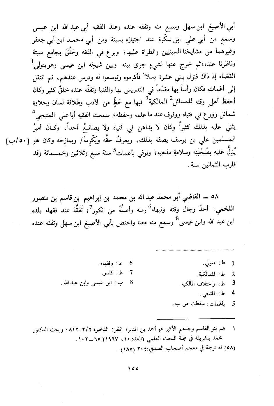 58- القاضي أبو محمد عبد الله بن محمد بن إبراهيم بن قاسم بن منصور اللخمي: أحد رجال وقته ونبهاء زمنه وأصله من نكور؛ تفقه عند فقهاء بلده ابن عبد الله وابن عيسى وسمع منه معنا واختص بأبي الأصبغ ابن سهل وتفقه عنده