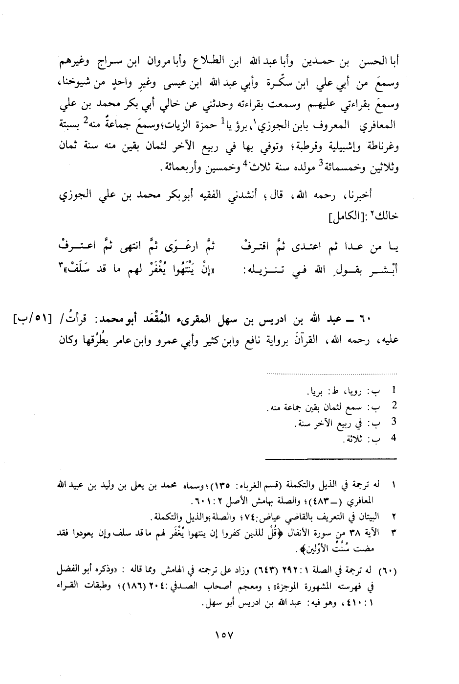 60- عبد الله بن إدريس بن سهل المقرئ المقعد أبو محمد: قرأت عليه، رحمه الله، القرآن برواية نافع وابن كثير وأبي عمرو وابن عامر بطرقها وكان
