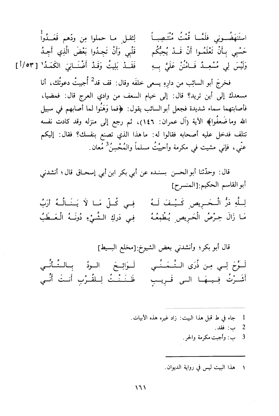 قال: وحدثنا أبو الحسن بسنده عن أبي بكر ابن أبي إسحاق قال؛ أنشدني أبو القاسم الحكيم: