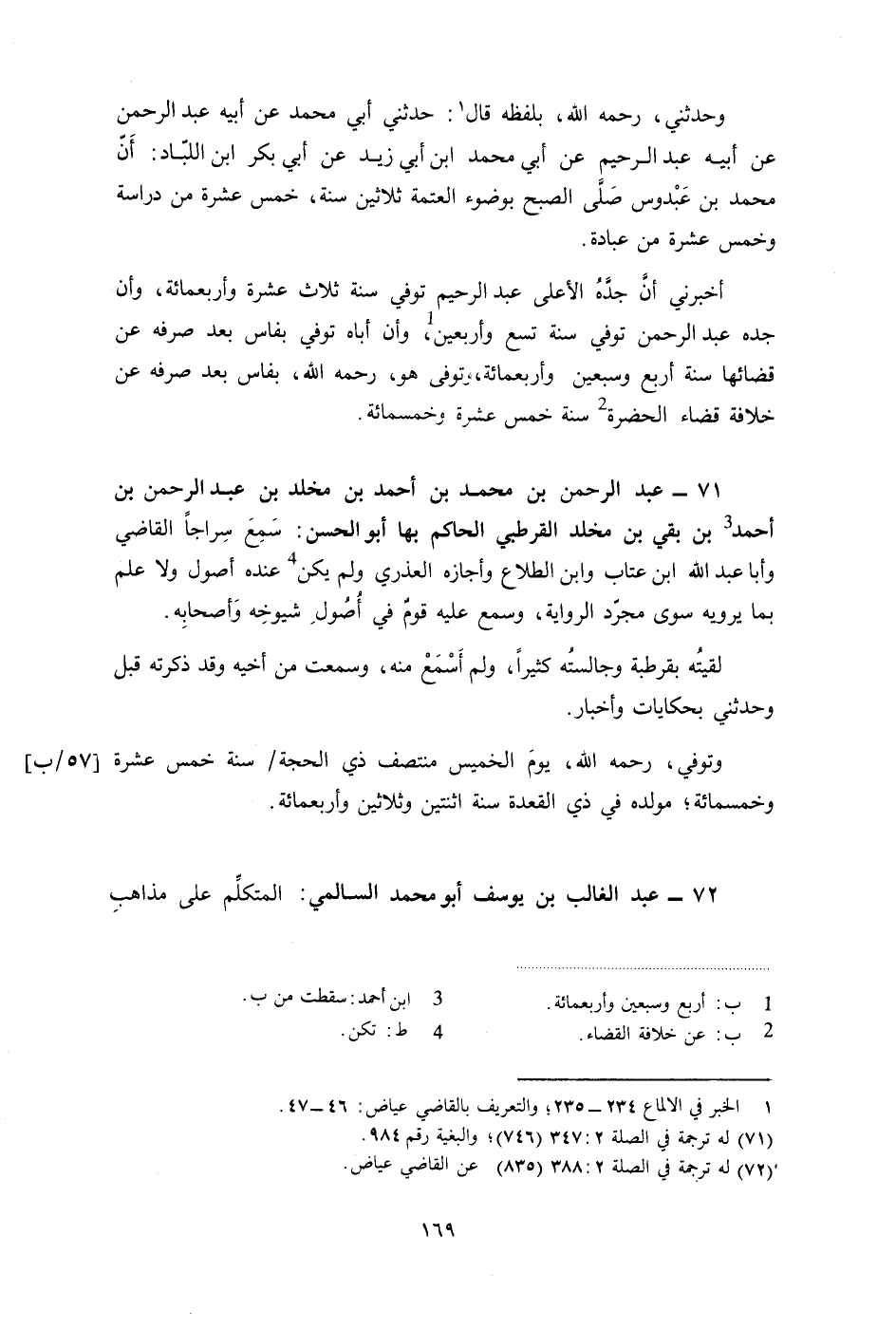71- عبد الرحمن بن محمد بن أحمد بن مخلد بن عبد الرحمن بن أحمد بن بقي بن مخلد القرطبي الحاكم بها أبو الحسن: سمع سراجاً القاضي وأبا عبد الله ابن عتاب وابن الطلاع وأجازه العذري ولم يكن عنده أصول ولا علم بما يرويه سوى مجرد الرواية، وسمع عليه قومٌ في أصول شيوخه وأصحابه.