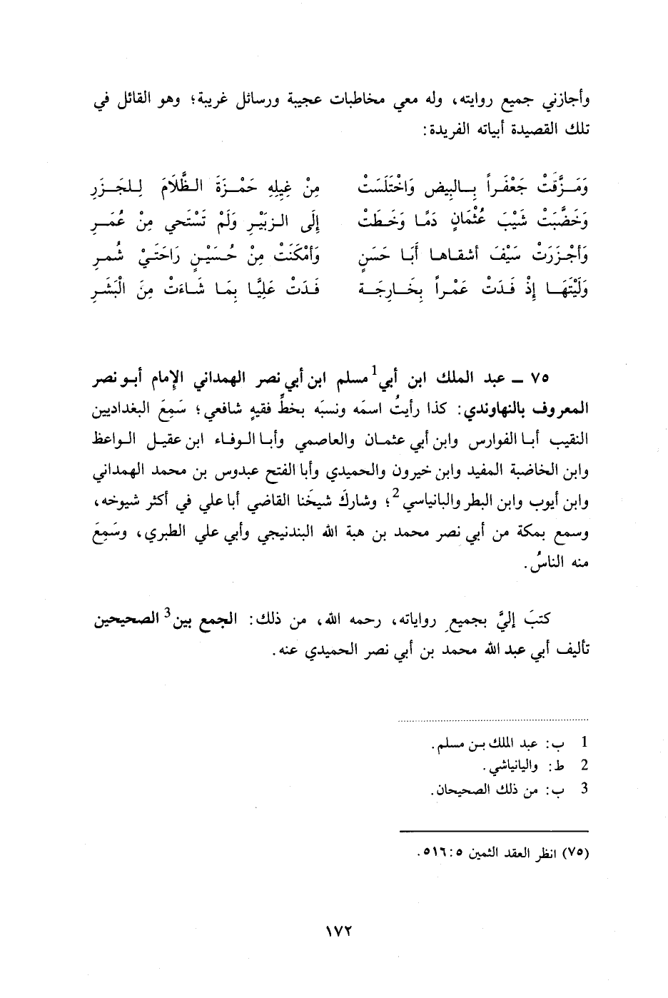 75- عبد الملك ابن أبي مسلم ابن أبي نصر الهمداني الإمام أبو نصر المعروف بالنهاوندي: كذا رأيت اسمه ونسبه بخط فقيهٍ شافعي؛ سمع البغداديين النقيب أبا الفوارس وابن أبي عثمان والعاصمي وأبا الوفاء ابن عقيل الواعظ وابن الخاضبة المفيد وابن خيرون والحميدي وأبا الفتح عبدوس بن محمد الهمداني وابن أيوب وابن البطر والبانياسي؛ وشارك شيخنا القاضي أبا علي في أكثر شيوخه، وسمع بمكة من أبي نصر محمد بن هبة الله البندنيجي وأبي علي الطبري، وسمع منه الناس.