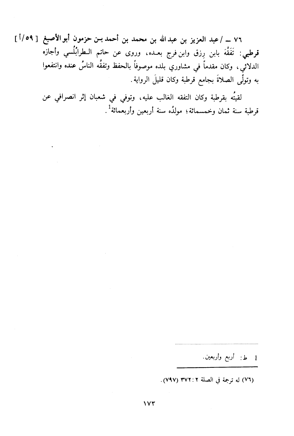 76- عبد العزيز بن عبد الله بن محمد بن أحمد بن حزمون أبو الأصبغ قرطبي: تفقه بابن رزق وابن فرج بعده، وروى عن حاتم الطرابلسي وأجازه الدلائي، وكان مقدماً في مشاوري بلده موصوفاً بالحفظ وتفقه الناس عنده وانتفعوا به وتولى الصلاة بجامع قرطبة وكان قليل الرواية.