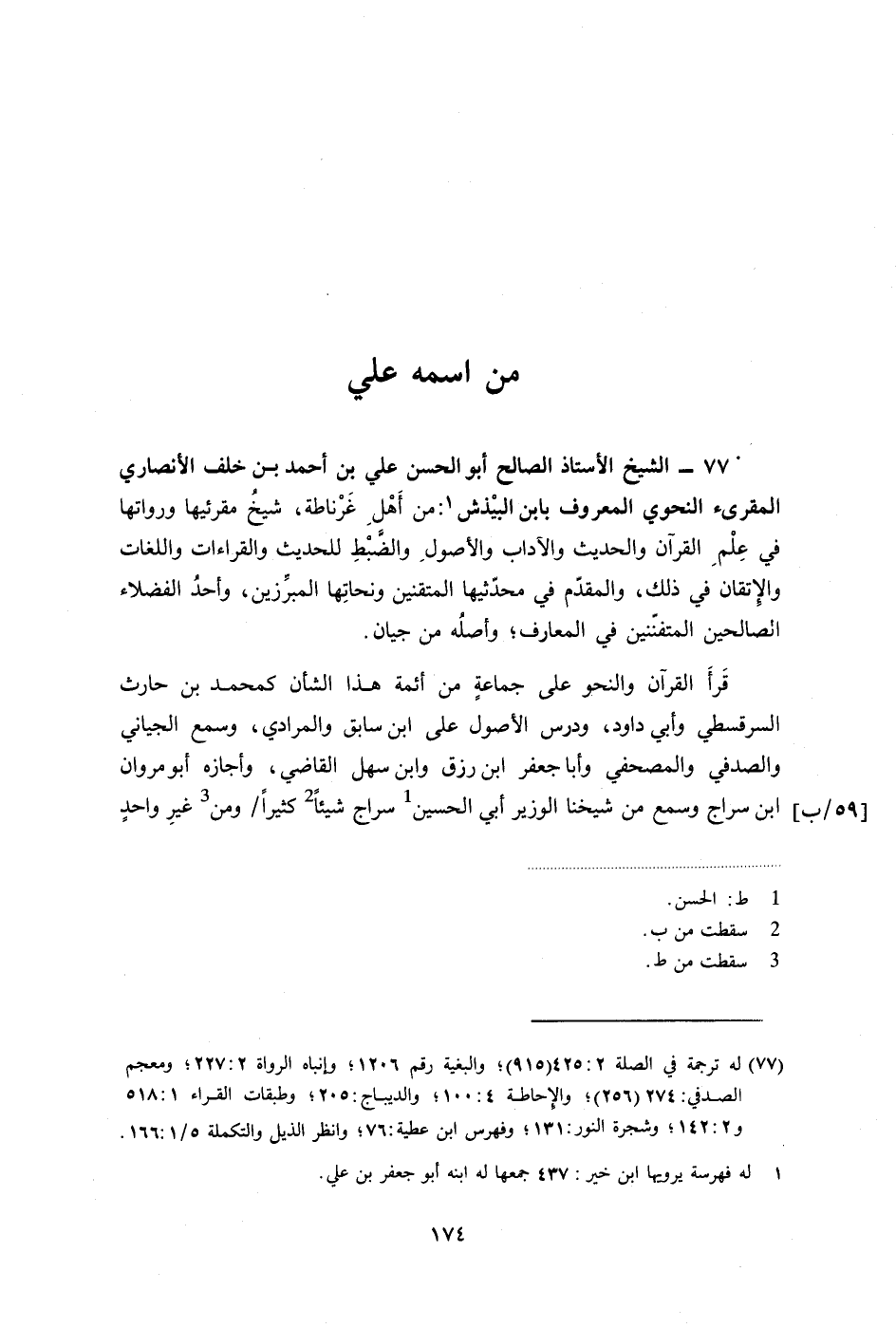 77- الشيخ الأستاذ الصالح أبو الحسن علي بن أحمد بن خلف الأنصاري المقرئ النحوي المعروف بابن البيذش: من أهل غرناطة، شيخ مقرئيها ورواتها في علم القرآن والحديث والآداب والأصول والضبط للحديث والقراءات واللغات والإتقان في ذلك، والمقدم في محدثيها المتقنين ونحاتها المبرزين، وأحد الفضلاء الصالحين المتفننين في المعارف؛ وأصله من جيان.