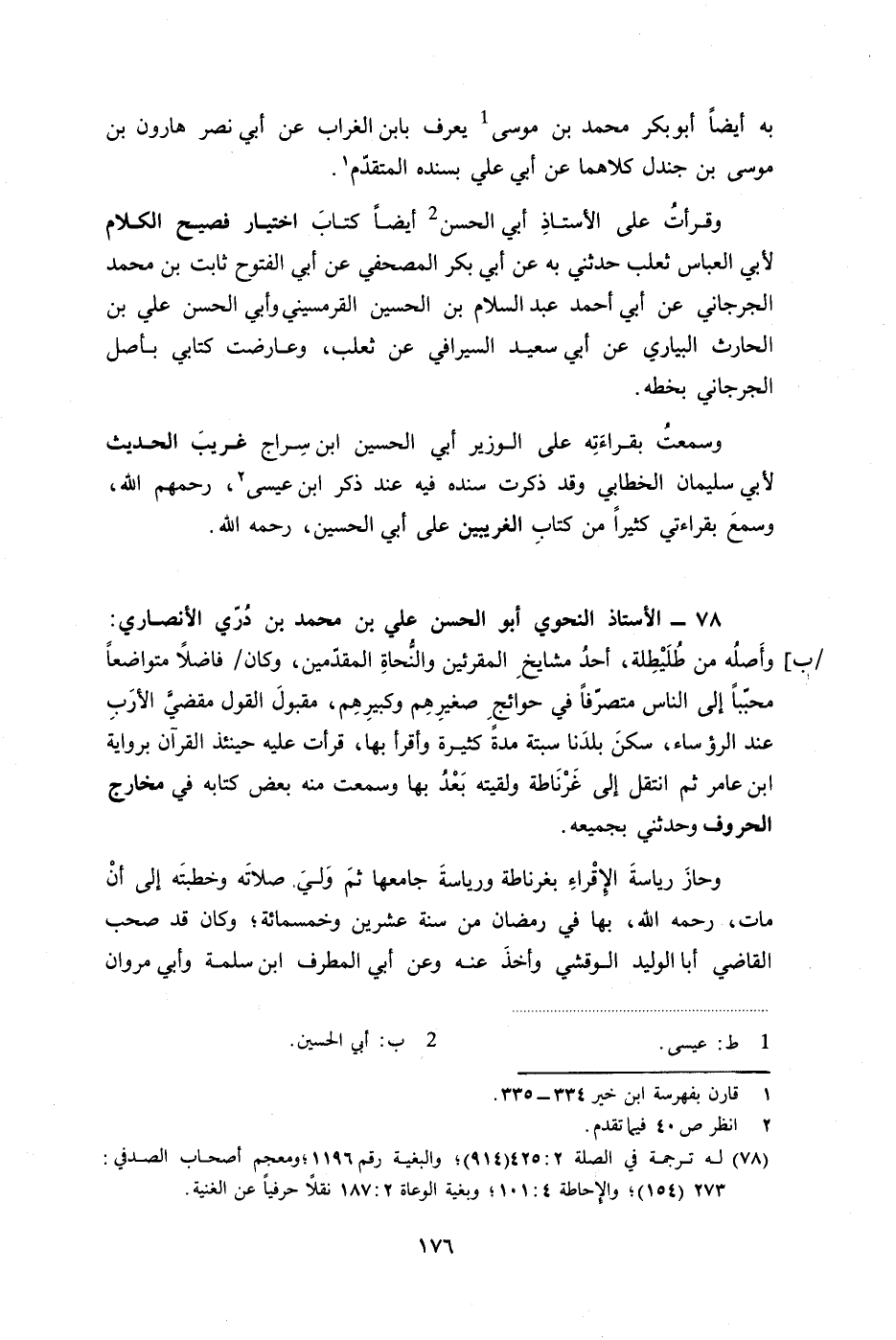 78- الأستاذ النحوي أبو الحسن علي بن محمد بن دري الأنصاري: وأصله من طليطلة، أحد مشايخ المقرئين والنحاة المقدمين، وكان فاضلاً متواضعاً محبباً إلى الناس متصرفاً في حوائج صغيرهم وكبيرهم، مقبول القول مقضي الأرب عند الرؤساء، سكن بلدنا سبتة مدةً كثيرة وأقرأ بها، قرأت عليه حينئذ القرآن برواية ابن عامر ثم انتقل إلى غرناطة ولقيته بعد بها وسمعت منه بعض كتابه في مخارج الحروف وحدثني بجميعه.
