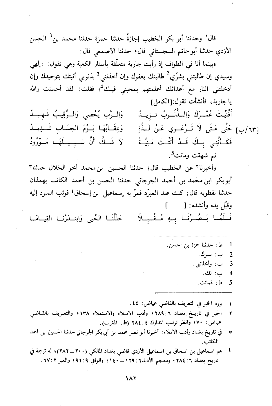 وأخبرنا عن الخطيب قال؛ حدثنا الحسين بن محمد أخو الخلال حدثنا أبو بكر ابن محمد بن أحمد الجرجاني حدثنا الحسن بن أحمد الكاتب بهمذان حدثنا نفطويه قال؛ كنت عند المبرد فمر به إسماعيل بن إسحاق فوثب المبرد إليه وقبل يده وأنشده: