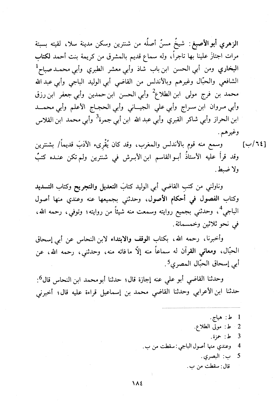 وأخبرنا، رحمه الله، بكتاب الوقف والابتداء لابن النحاس عن أبي إسحاق الحبال، ومعاني القرآن له سماعاً منه إلا ما فاته منه، وحدثني، رحمه الله، عن أبي إسحاق الحبال المصري.