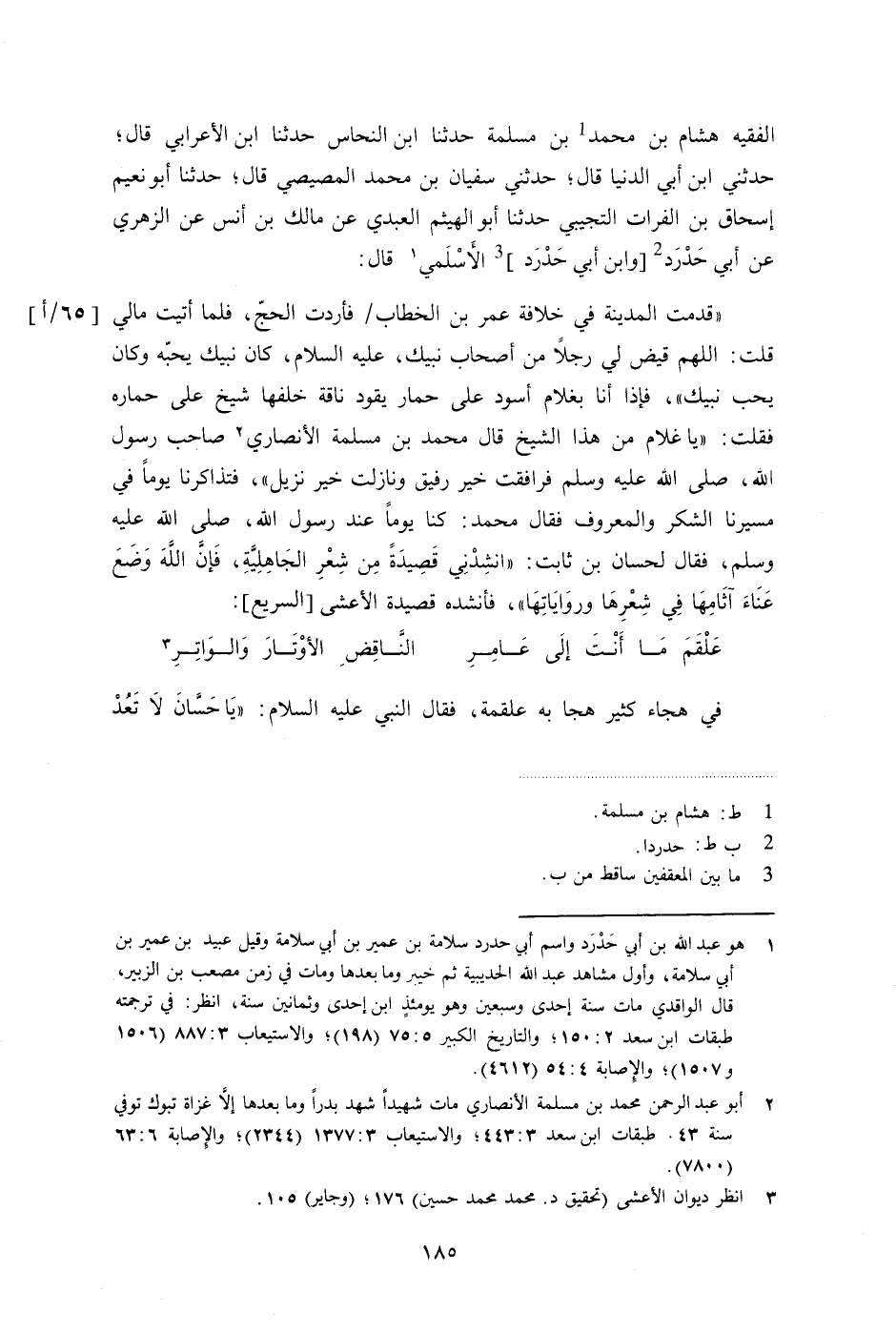 ((قدمت المدينة في خلافة عمر بن الخطاب فأردت الحج، فلما أتيت مالي قلت: اللهم قيض لي رجلاً من أصحاب نبيك، عليه السلام، كان نبيك يحبه وكان يحب نبيك)) ، فإذا أنا بغلام أسود على حمار يقود ناقة خلفها شيخ على حماره فقلت: ((يا غلام من هذا الشيخ قال محمد بن مسلمة الأنصاري صاحب رسول الله، صلى الله عليه وسلم، فرافقت خير رفيق ونازلت خير نزيل)) ، فتذاكرنا يوماً في مسيرنا الشكر والمعروف فقال محمد: كنا يوماً عند رسول الله، صلى الله عليه وسلم، فقال لحسان بن ثابت: ((أنشدني قصيدةً من شعر الجاهلية، فإن الله وضع عناء آثامها في شعرها ورواياتها)) ، فأنشده قصيدة الأعشى: