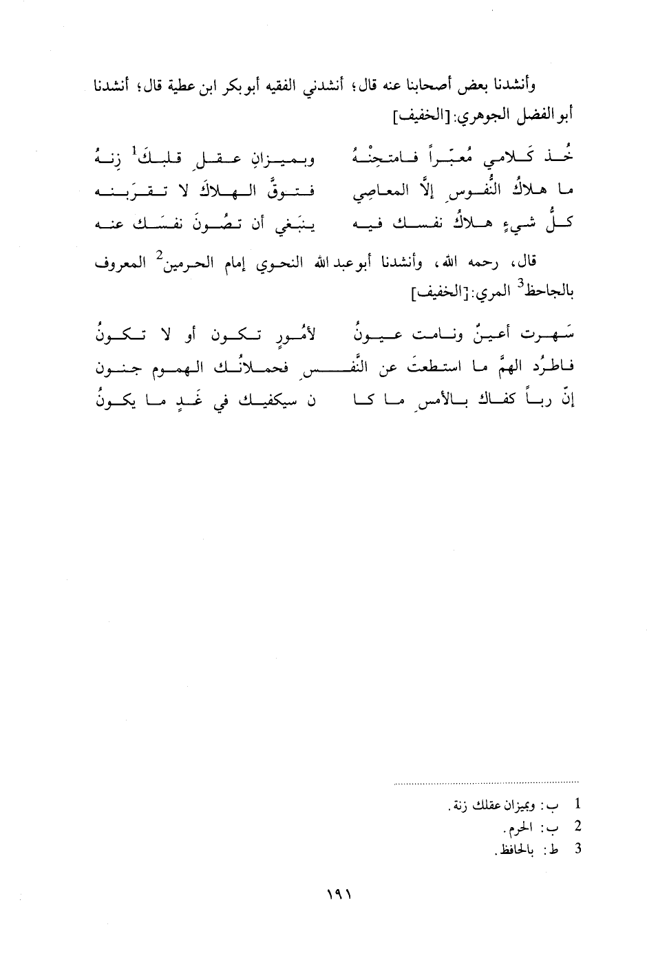 قال، رحمه الله، وأنشدنا أبو عبد الله النحوي إمام الحرمين المعروف بالجاحظ المري: