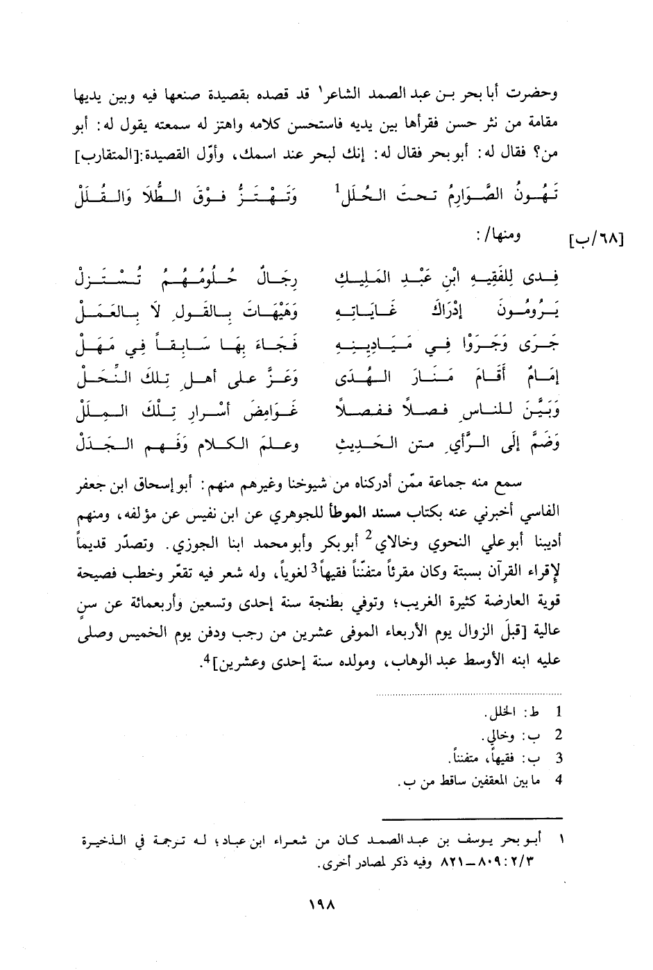 سمع منه جماعة ممن أدركناه من شيوخنا وغيرهم منهم: أبو إسحاق ابن جعفر الفاسي أخبرني عنه بكتاب مسند الموطأ للجوهري عن ابن نفيس عن مؤلفه، ومنهم أديبنا أبو علي النحوي وخالاي أبو بكر وأبو محمد ابنا الجوزي. وتصدر قديماً لإقراء القرآن بسبتة وكان مقرئاً متفنناً فقيهاً لغوياً، وله شعر فيه تقعر وخطب فصيحة قوية العارضة كثيرة الغريب، وتوفي بطنجة سنة إحدى وتسعين وأربعمائة عن سن عالية [قبل الزوال يوم الأربعاء الموفى عشرين من رجب ودفن يوم الخميس وصلى عليه ابنه الأوسط عبد الوهاب، ومولده سنة إحدى وعشرين] .