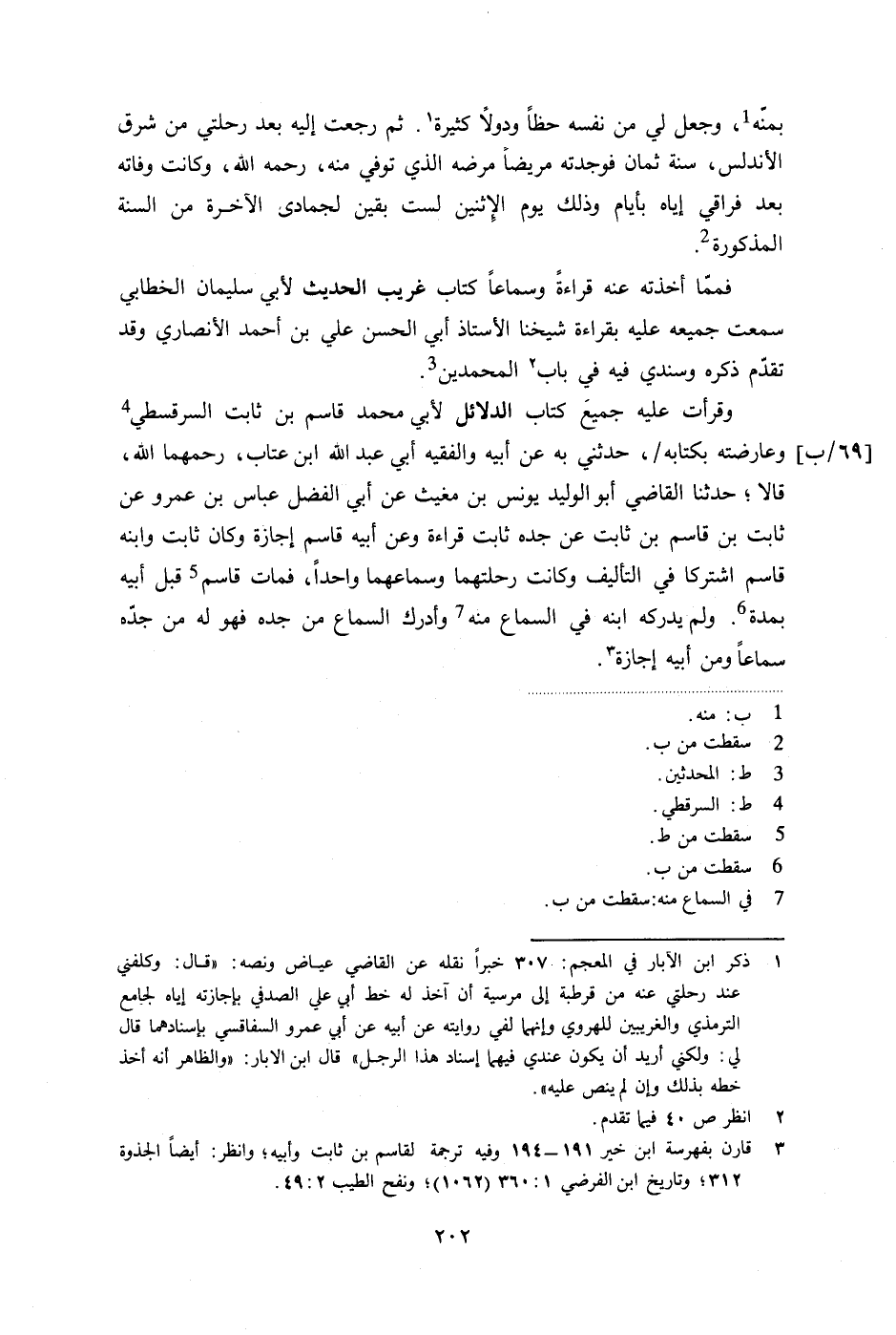 وقرأت عليه جميع كتاب الدلائل لأبي محمد قاسم بن ثابت السرقسطي وعارضته بكتابه، حدثني به عن أبيه والفقيه أبي عبد الله ابن عتاب، رحمهما الله، قالا؛ حدثنا القاضي أبو الوليد يونس بن مغيث عن أبي الفضل عباس بن عمرو عن ثابت بن قاسم بن ثابت عن جده ثابت قراءة وعن أبيه قاسم إجازة وكان ثابت وابنه قاسم اشتركا في التأليف وكانت رحلتهما وسماعهما واحداً، فمات قاسم قبل أبيه بمدة. ولم يدركه ابنه في السماع منه وأدرك السماع من جده فهو له من جده سماعاً ومن أبيه إجازة.