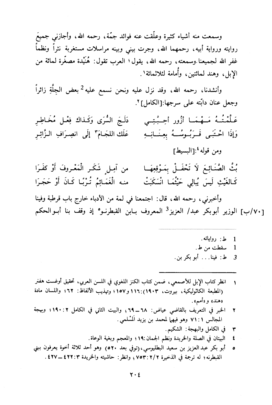 وسمعت منه أشياء كثيرة وعلقت عنه فوائد جمة، رحمه الله، وأجازني جميع روايته ورواية أبيه، رحمهما الله، وجرت بيني وبينه مراسلات مستغربة نثراً ونظماً غفر الله لجميعنا وسمعته، رحمه الله، يقول؛ العرب تقول: هنيدة مصغرة لمائة من الإبل، وهند لمائتين، وأمامة لثلاثمائة.