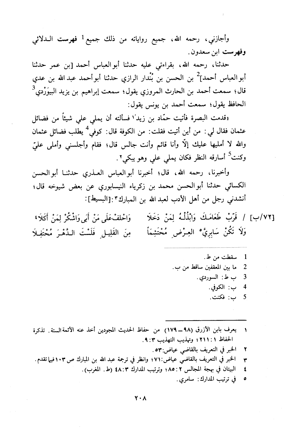 وأخبرنا، رحمه الله، قال؛ أخبرنا أبو العباس العذري حدثنا أبو الحسن الكسائي حدثنا أبو الحسن محمد بن زكرياء النيسابوري عن بعض شيوخه قال؛ أنشدني رجل من أهل الأدب لعبد الله بن المبارك: