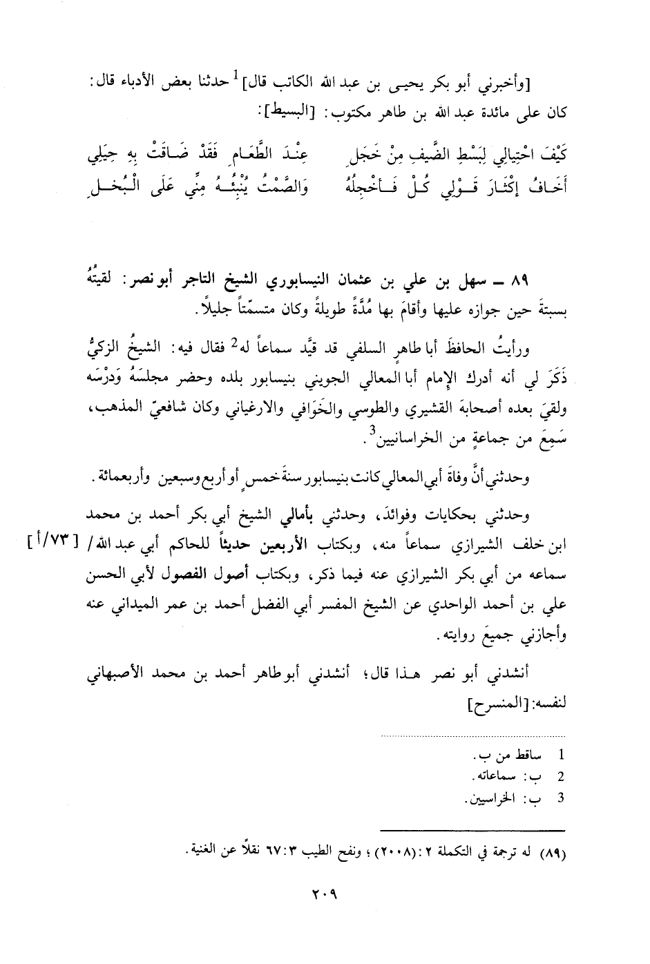 أنشدني أبو نصر هذا قال؛ أنشدني أبو طاهر أحمد بن محمد الأصبهاني لنفسه: