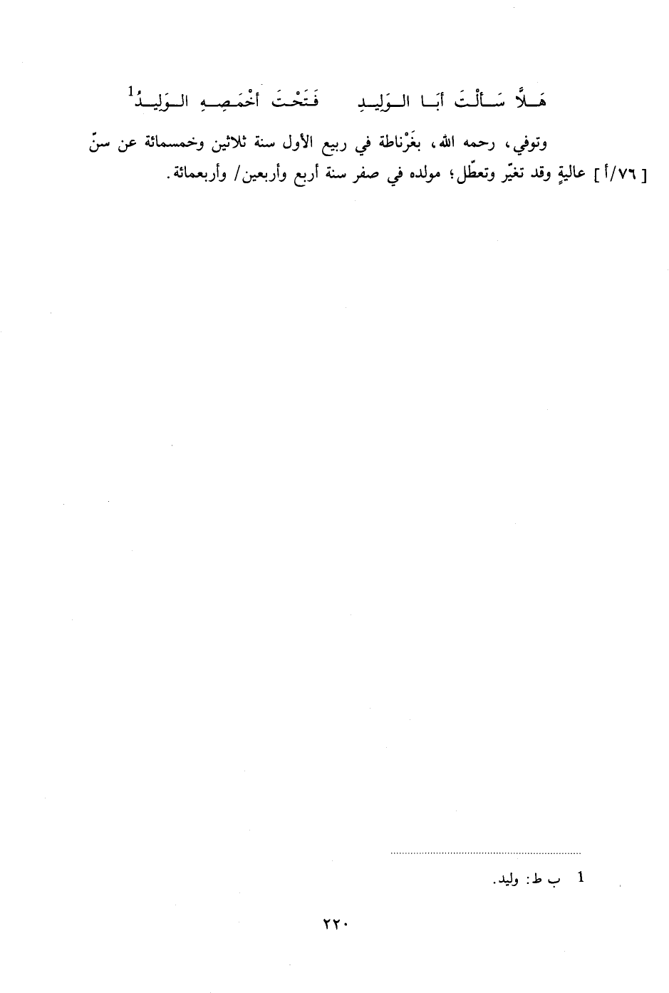 وتوفي، رحمه الله، بغرناطة في ربيع الأول سنة ثلاثين وخمسمائة عن سن عالية وقد تغير وتعطل؛ مولده في صفر سنة أربع وأربعين وأربعمائة.