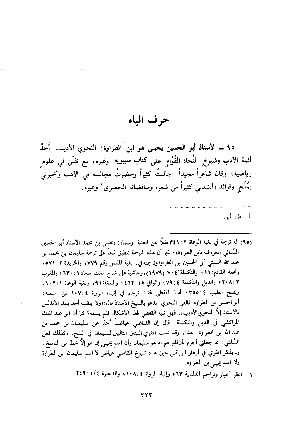 95- الأستاذ أبو الحسين يحيى هو ابن الطراوة: النحوي الأديب أحد أئمة الأدب وشيوخ النحاة القوام على كتاب سيبويه وغيره، مع تفنن في علومٍ رياضية؛ وكان شاعراً مجيداً. جالسته كثيراً وحضرت مجالسه في الأدب وأخبرني بملحٍ وفوائد وأنشدني كثيراً من شعره ومناقضاته الحصري وغيره.