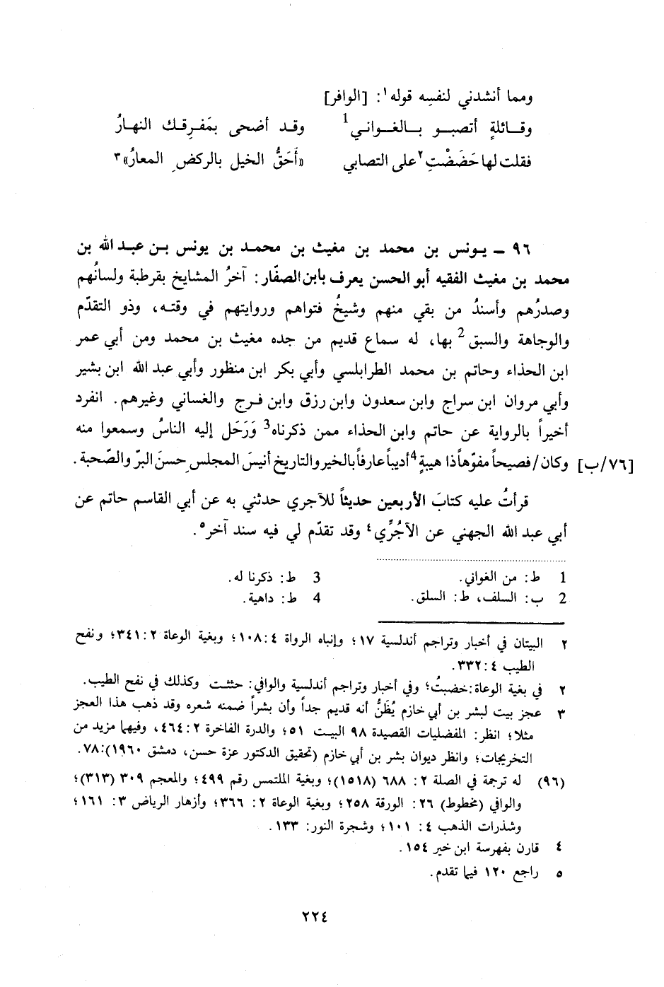 96- يونس بن محمد بن مغيث بن محمد بن يونس بن عبد الله بن محمد بن مغيث الفقيه أبو الحسن يعرف بابن الصفار: آخر المشايخ بقرطبة ولسانهم وصدرهم وأسند من بقي منهم وشيخ فتواهم وروايتهم في وقته، وذو التقدم والوجاهة والسبق بها، له سماع قديم من جده مغيث بن محمد ومن أبي عمر ابن الحذاء وحاتم بن محمد الطرابلسي وأبي بكر ابن منظور وأبي عبد الله ابن بشير وأبي مروان ابن سراج وابن سعدون وابن رزق وابن فرج والغساني وغيرهم. انفرد أخيراً بالرواية عن حاتم وابن الحذاء ممن ذكرناه ورحل إليه الناس وسمعوا منه وكان فصيحاً مفوهاً ذا هيبةٍ أديباً عارفاً بالخير والتاريخ أنيس المجلس حسن البر والصحبة.