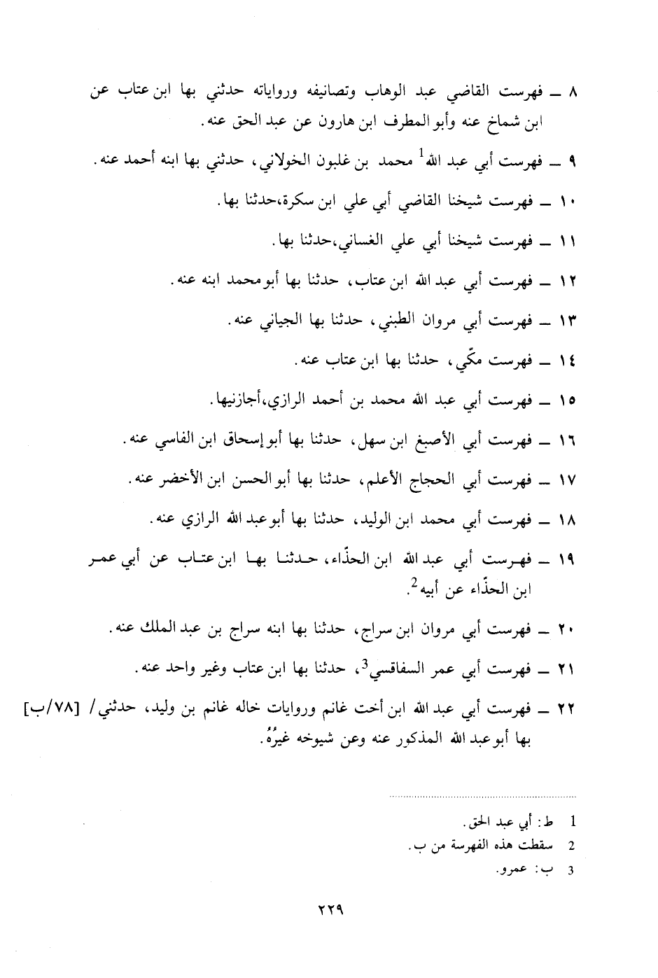 8- فهرست القاضي عبد الوهاب وتصانيفه ورواياته حدثني بها ابن عتاب عن ابن شماخ عنه وأبو المطرف ابن هارون عن عبد الحق عنه.