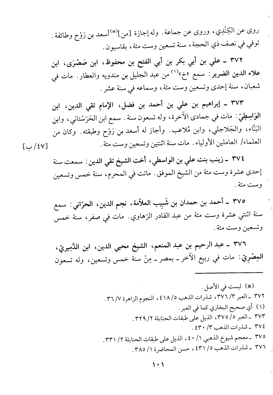374- زينب بنت علي بن الواسطي، أخت الشيخ تقي الدين: سمعت سنة إحدى عشرة وست مئة من الشيخ الموفق. ماتت في المحرم، سنة خمس وتسعين وست مئة.