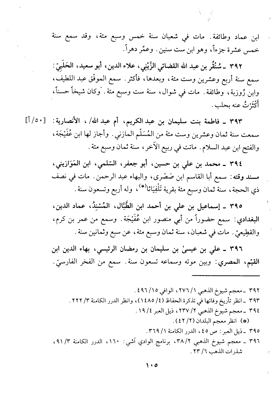 396- علي بن عيسى بن سليمان بن رمضان الرئيسي، بهاء الدين ابن القيم، المصري: وبين موته وسماعه تسعون سنة. سمع من الفخر الفارسي.