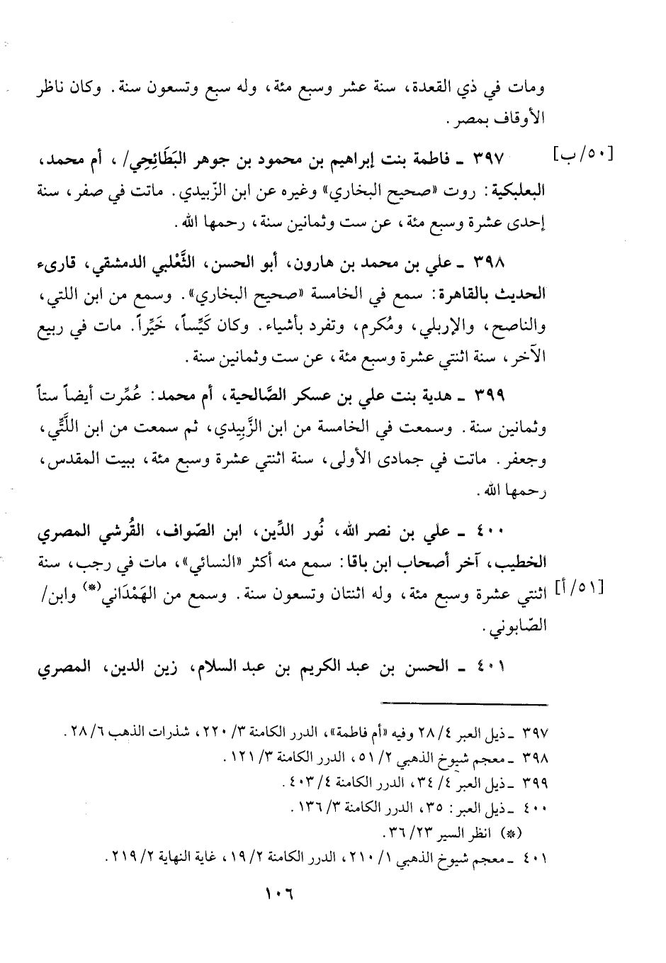 400- علي بن نصر الله، نور الدين، ابن الصواف، القرشي المصري الخطيب، آخر أصحاب ابن باقا: سمع منه أكثر ((النسائي))، مات في رجب، سنة اثنتي عشرة وسبع مئة، وله اثنتان وتسعون