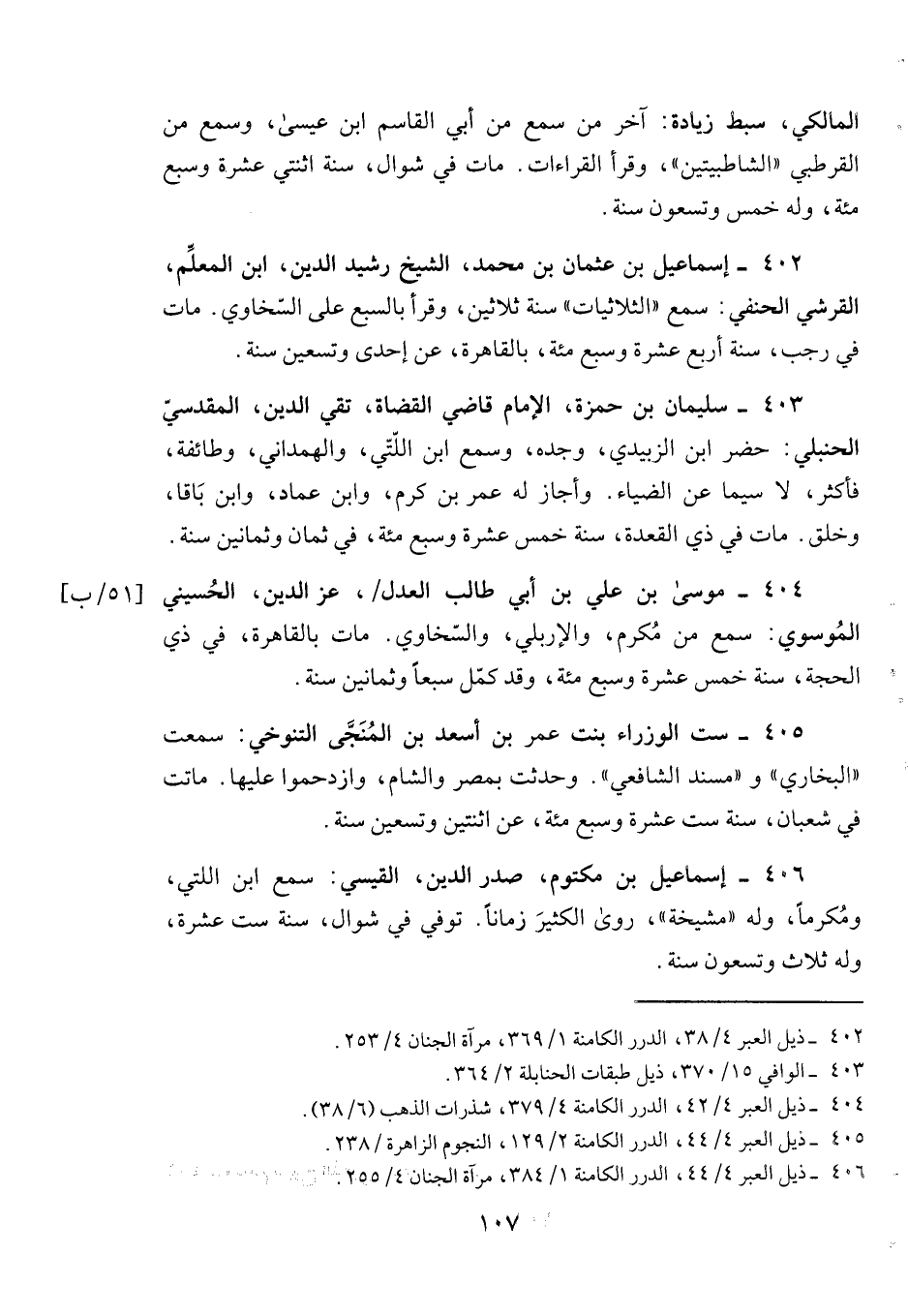 406- إسماعيل بن مكتوم، صدر الدين، القيسي: سمع ابن اللتي، ومكرماً، وله ((مشيخة))، روى الكثير زماناً. توفي في شوال، سنة ست عشرة، وله ثلاث وتسعون سنة.