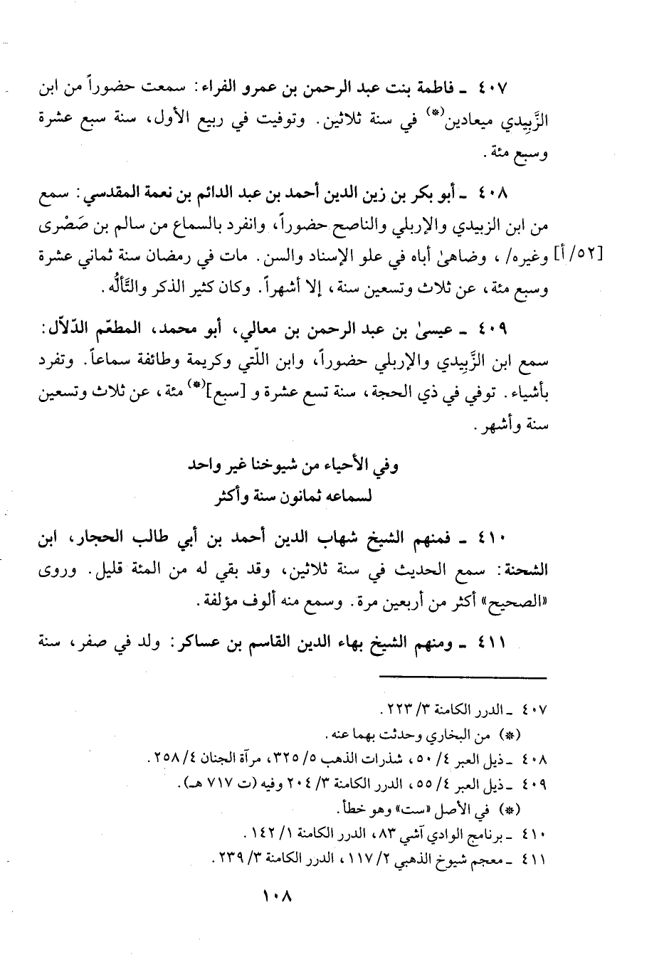 407- فاطمة بنت عبد الرحمن بن عمرو الفراء: سمعت حضوراً من ابن الزبيدي ميعادين في سنة ثلاثين. وتوفيت في ربيع الأول، سنة سبع عشرة وسبع مئة.