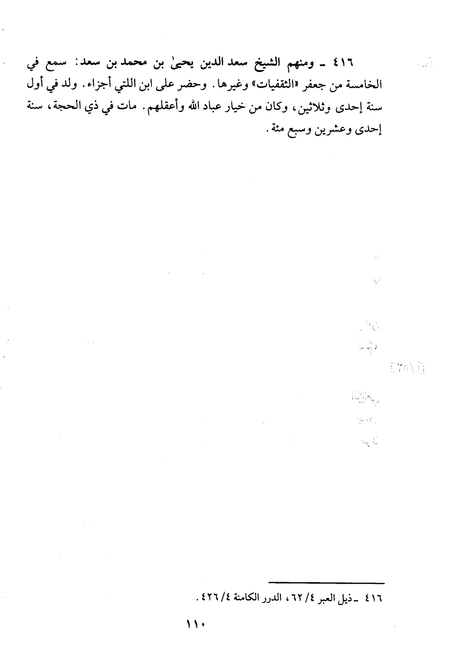 416- ومنهم الشيخ سعد الدين يحيى بن محمد بن سعد: سمع في الخامسة من جعفر ((الثقفيات)) وغيرها. وحضر على ابن اللتي أجزاء. ولد في أول سنة إحدى وثلاثين، وكان من خيار عباد الله وأعقلهم. مات في ذي الحجة، سنة إحدى وعشرين وسبع مئة.